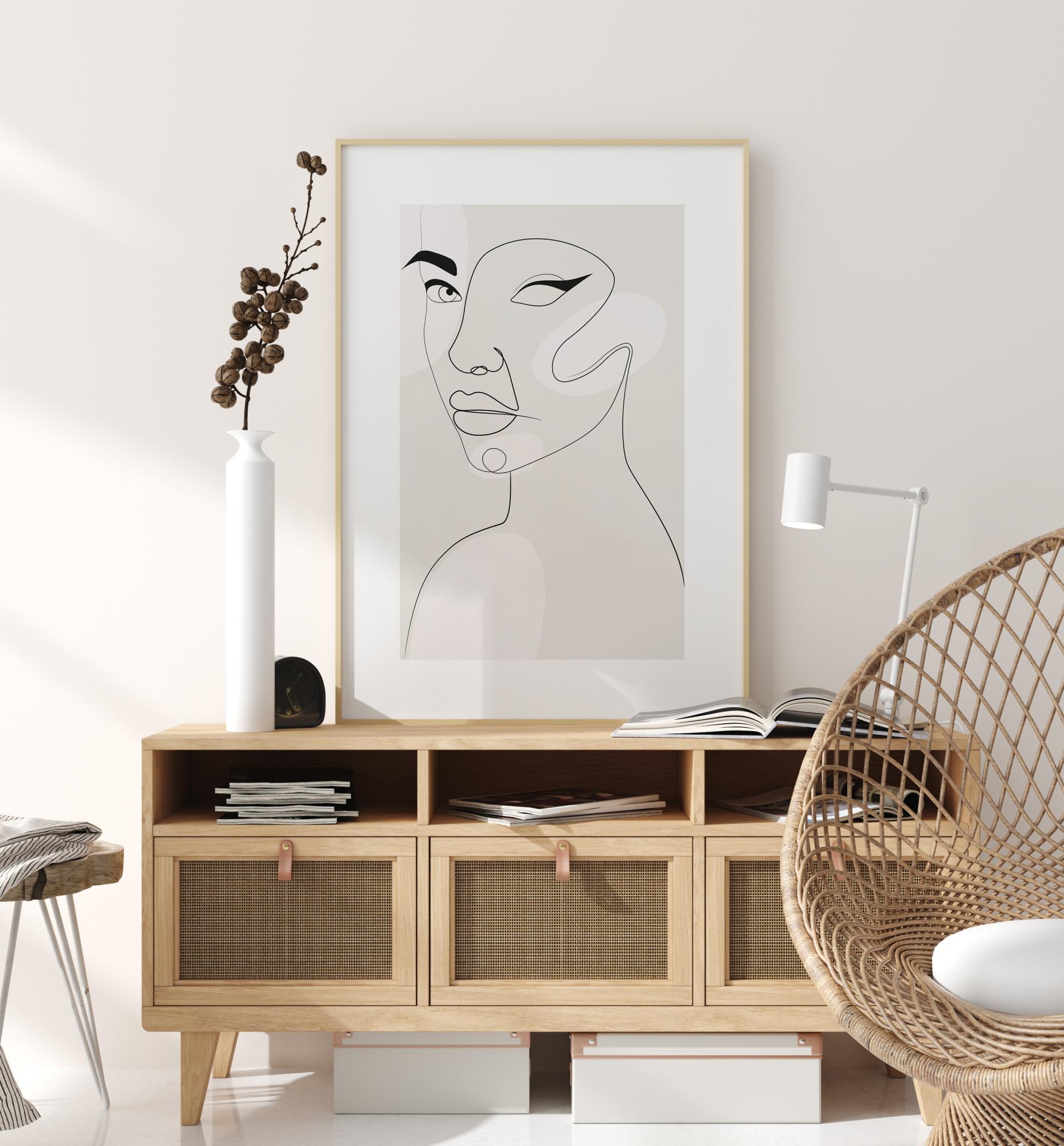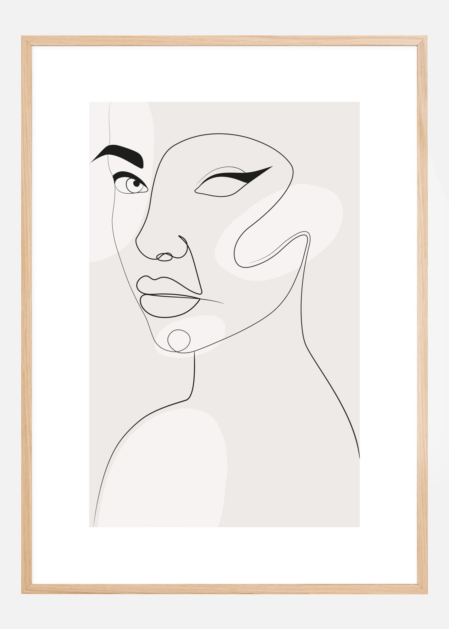 Ein modernistisches Poster mit einem abstrakten Frauengesicht. Dünne Linien wirbeln über die Seite, um ihr Gesicht zu gestalten. Ein Auge starrt einen mit starken Details an. Das andere ist unvollständig, aber mit einem schönen Eyeliner versehen. Sie hat einen hochmütigen Gesichtsausdruck, während sie Sie in diesem eleganten, minimalistischen Werk anschaut.