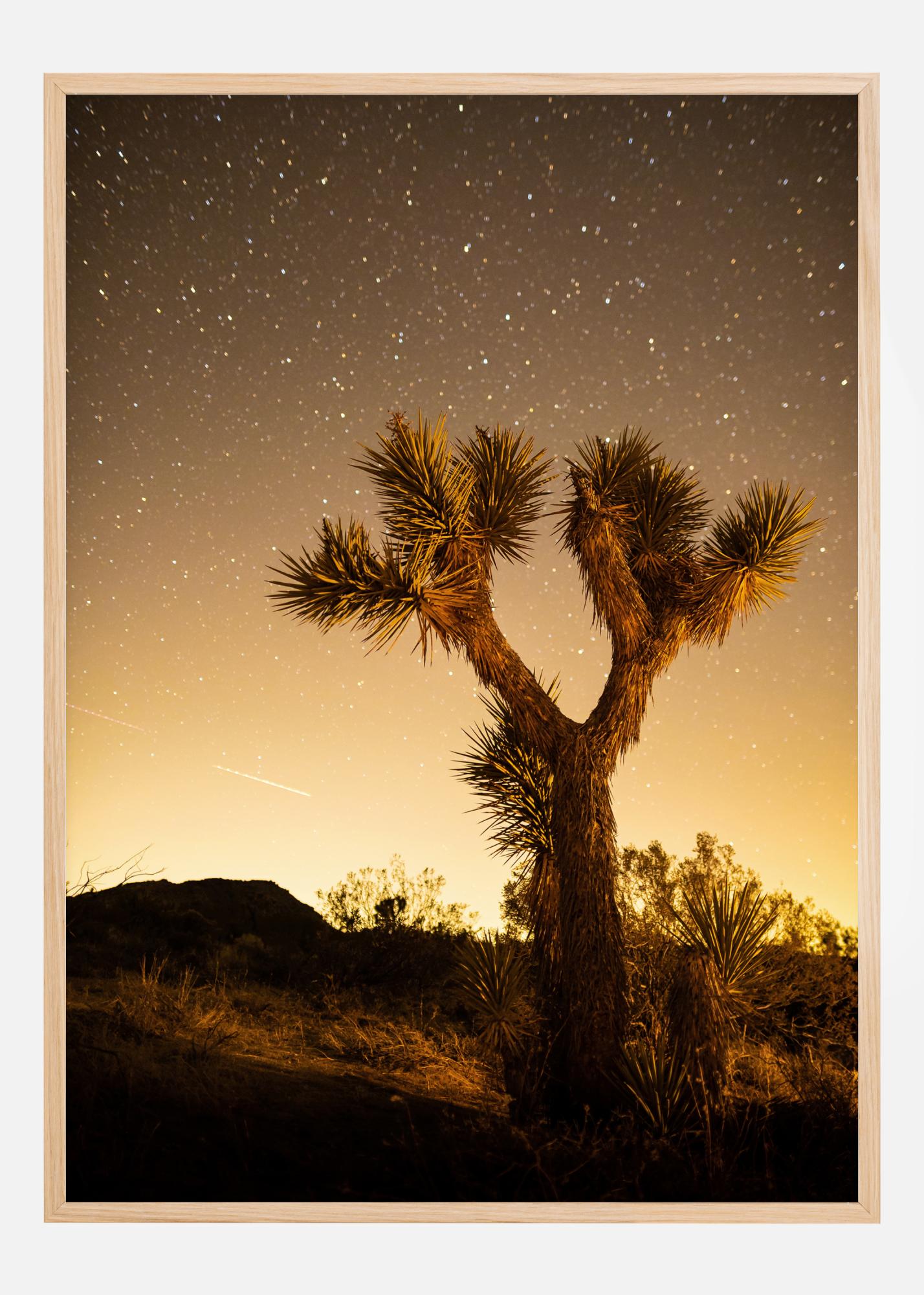 Ein nächtliches Poster eines großen Kaktus in der Wüste, der sich gegen den Nachthimmel voller Sterne abhebt. Der Kaktus ist in ein sanftes goldenes Licht getaucht, während die Sonne am Horizont untergeht. Die Sterne blinzeln sanft über einem warmen, weichen Himmel. Genießen Sie die Wärme dieses nächtlichen Wüstenhimmels.