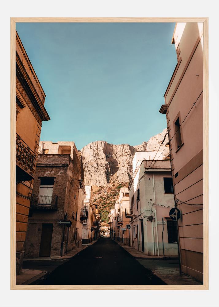 Perfekt für diejenigen, die sich nach der Wärme des Mittelmeers sehnen oder Elemente traditioneller Architektur in ihr Zuhause integrieren möchten, bietet dieses Poster eine Flucht in eine Welt, in der die Zeit stillzustehen scheint. Die Farbpalette reicht von dem tiefblauen Himmel bis zu den verschiedenen Pastelltönen, die die Fassaden der Gebäude zieren, hervorgehoben durch das weiche Licht, das vom mächtigen Berg reflektiert wird. Dieses Bild ist mehr als ein Einrichtungsdetail; es ist ein Tor zu einem anderen Ort und einer anderen Zeit, perfekt, um einen Raum mit Tiefe und Charakter zu schaffen.