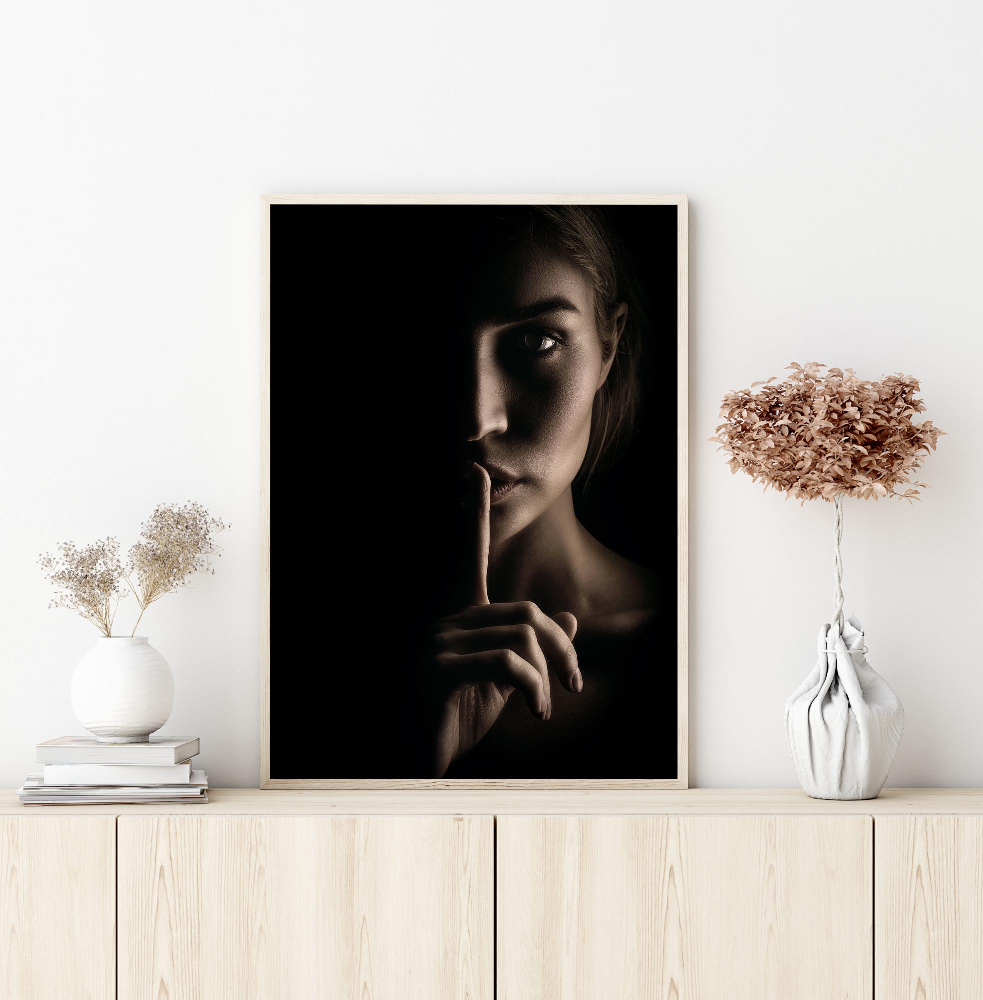 Ein mysteriöses Porträtposter mit dem Gesicht einer Frau, das halb im Schatten liegt. Ein Finger ist an ihre Lippen gelegt, um Sie ruhig zu halten, während sie Ihnen direkt in die Augen schaut. Die effektvolle Beleuchtung erzeugt auf der einen Seite ein sanftes Licht, während sie auf der anderen Seite in Schatten getaucht wird.