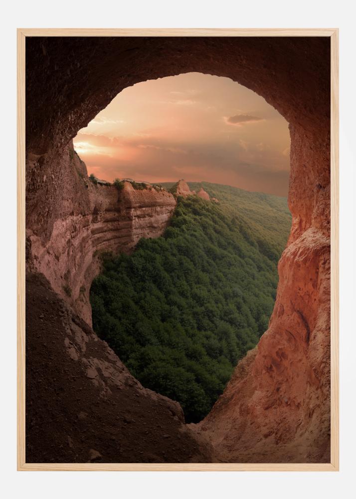 Ein atemberaubendes Poster einer effektvollen roten Landschaft. Schauen Sie durch die Öffnung in der Klippe und sehen Sie die roten Felsen, die sich in der Ferne erstrecken. Die wachsenden grünen Bäume bilden den perfekten Kontrast, während die Sonne untergeht und alles in ein warmes Licht taucht. Besuchen Sie diese Aussicht bequem von zu Hause aus.