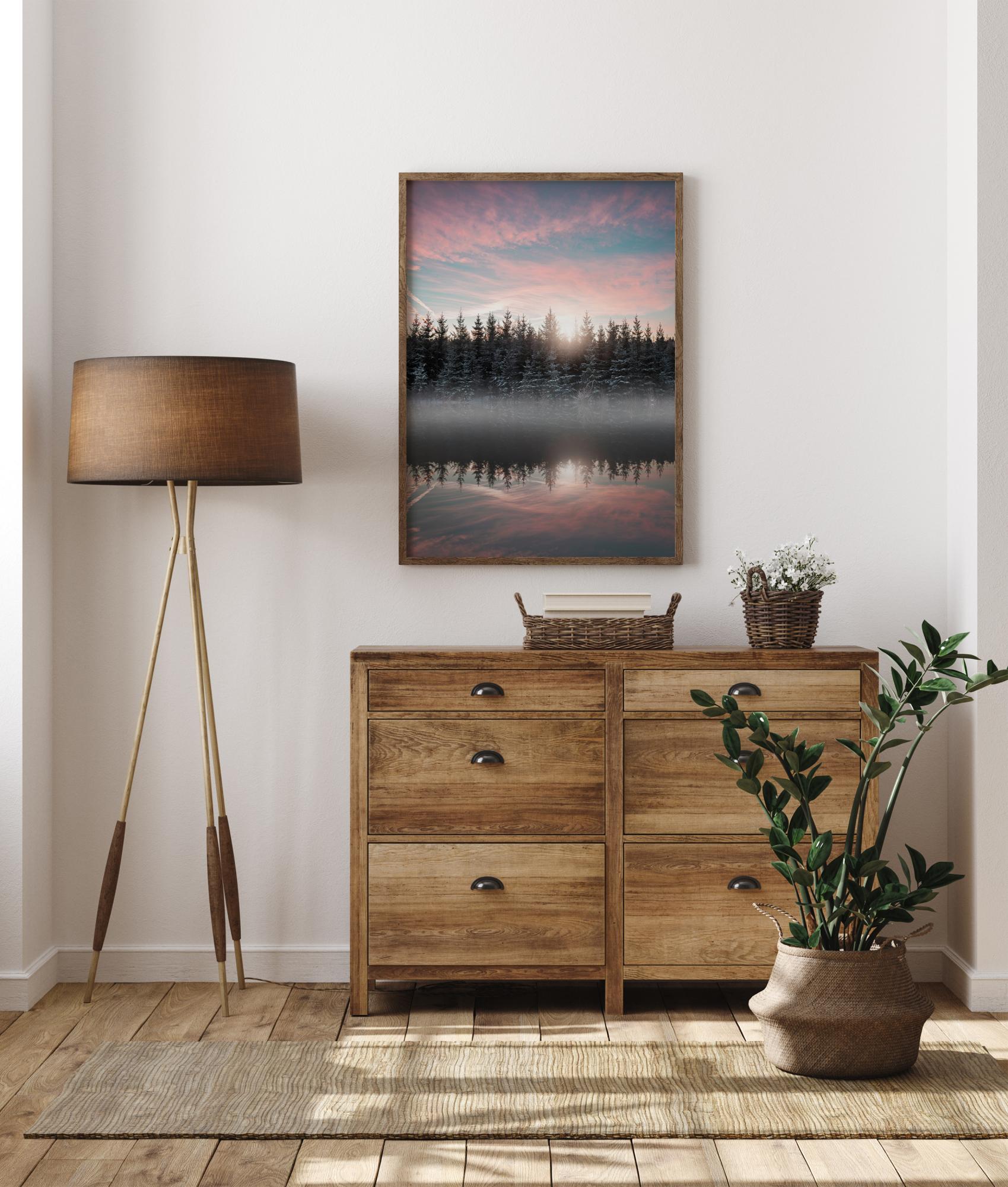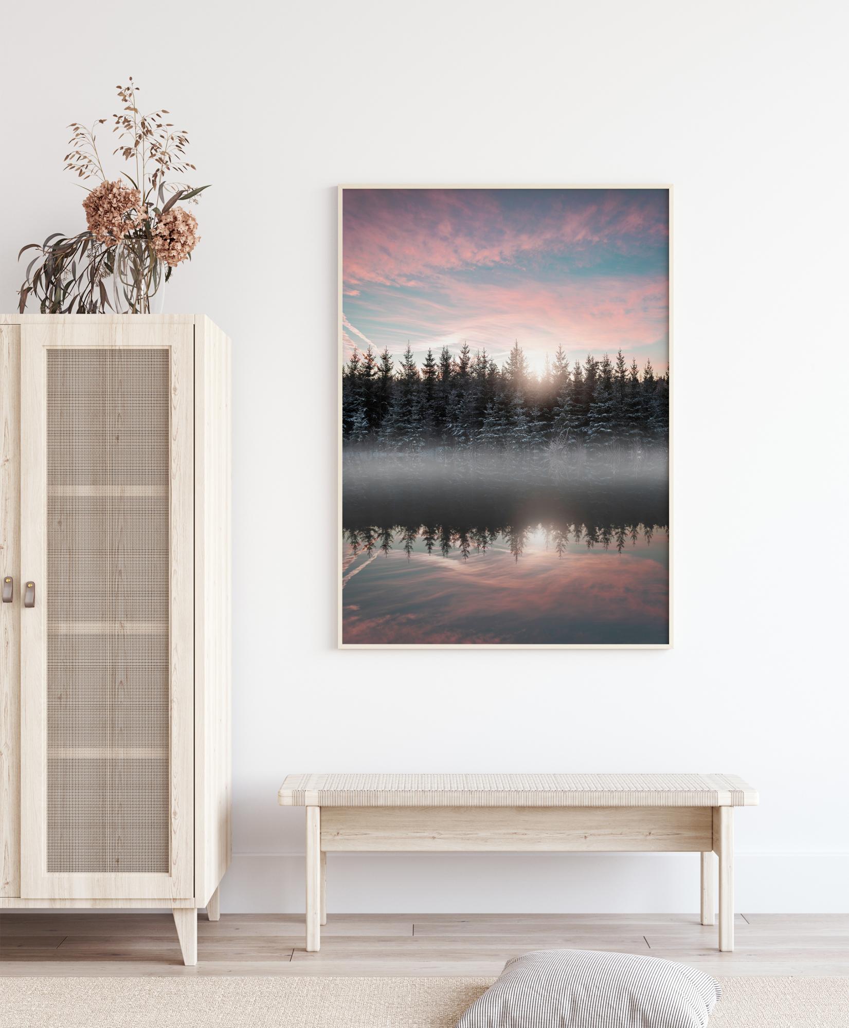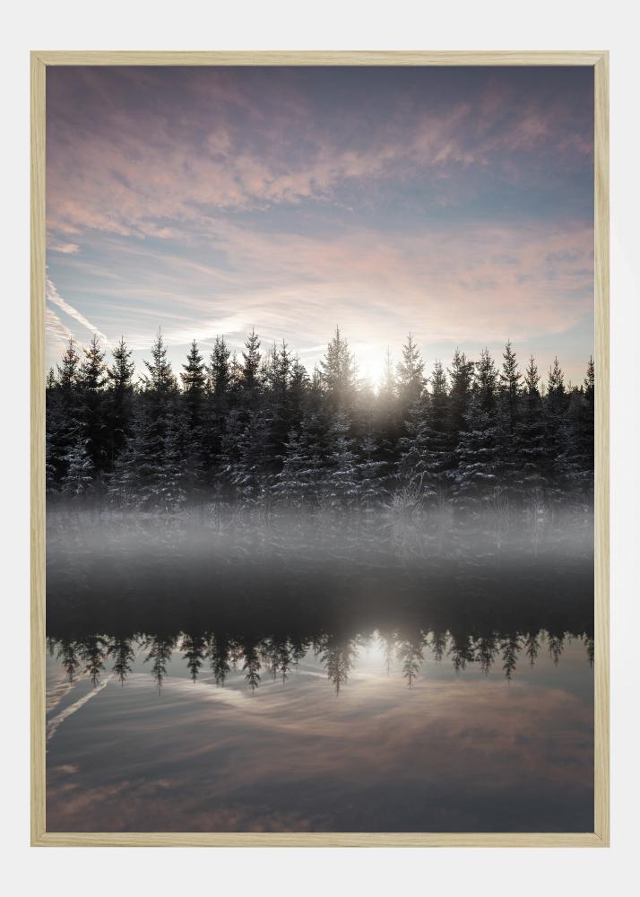 Ein magisches Poster eines nebligen Sees im frühen Morgenlicht. Am Ufer stehen schneebedeckte Bäume, die teilweise in Nebel gehüllt sind. Die Spiegelungen der Bäume finden sich in den sanften Pastellfarben des Sees wieder. Über den Baumwipfeln geht die Sonne auf und wirft ein sanftes Licht auf den rosafarbenen und blauen Himmel, was für eine heitere Atmosphäre sorgt.