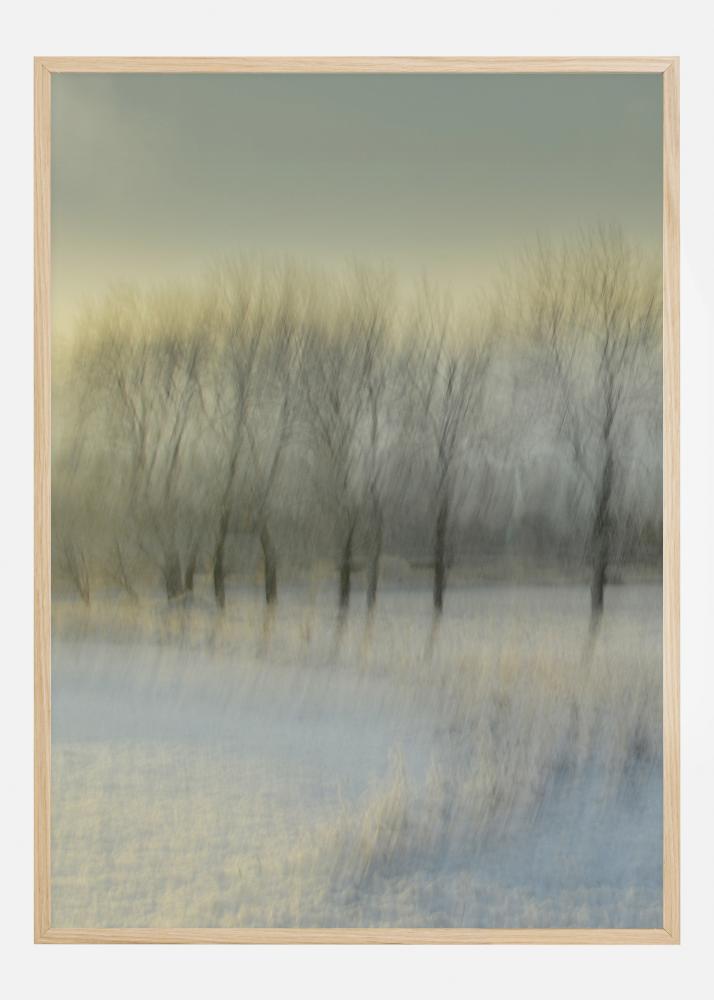 Ein atemberaubendes Poster im Stil einer Bewegungsunschärfe von Bäumen vor einem winterlichen Hintergrund. Weißer Schnee bedeckt alles in diesem weichen, unscharfen Bild. Die Bäume sind unscharf, nur die hohen schwarzen Stämme sind zu sehen, und ein Band aus weichem Gelb schwebt über den Baumkronen. Magie liegt in der Luft.