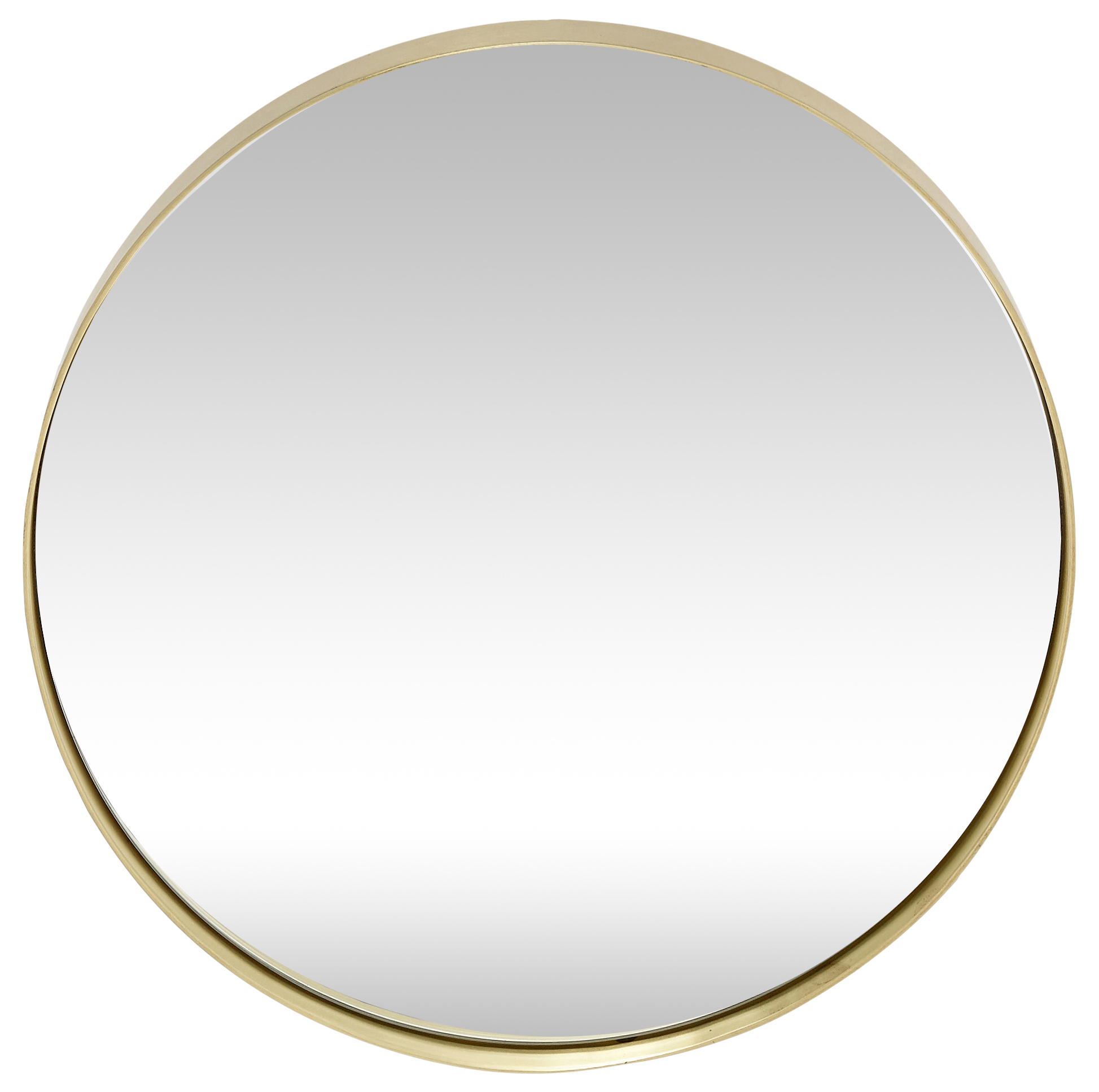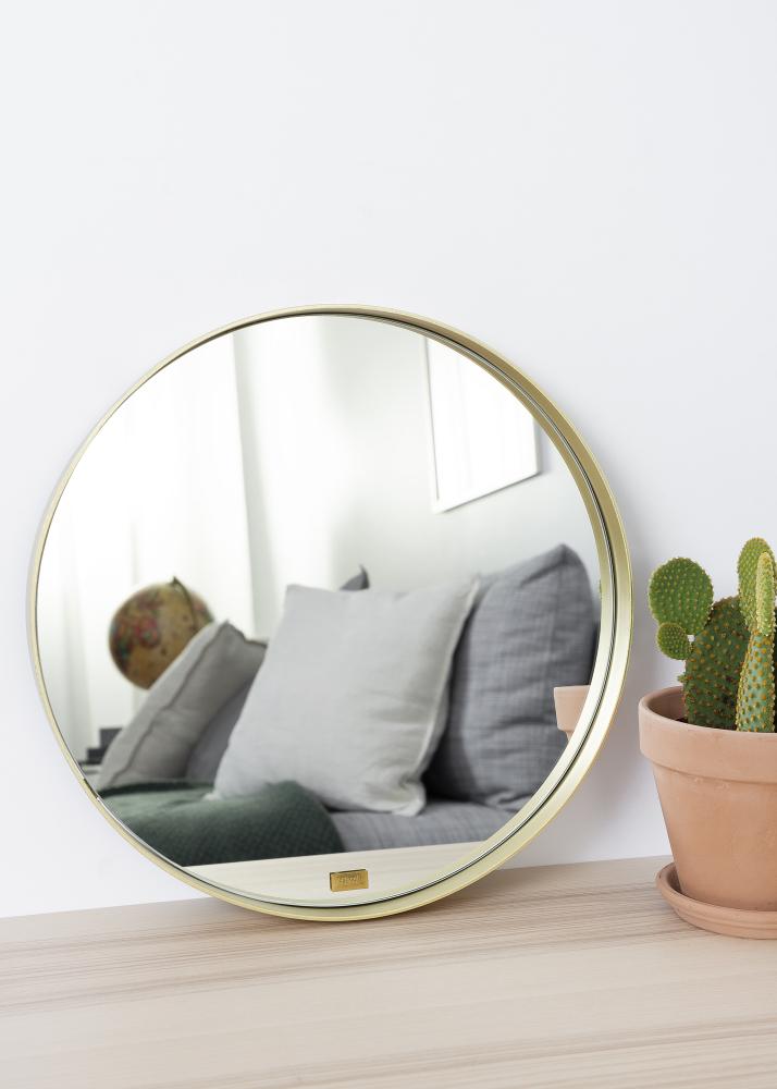 Runder Wandspiegel mit ansprechender, exklusiver Ausstrahlung. Der Spiegel wird von einem messingfarbenen Metallrahmen eingefasst. Schmal und stilvoll. Die Kante, einige Zentimenter tief, verleiht dem Spiegel einen exquisiten, eleganten Touch und rundet dieses Wohnaccessoire geschmackvoll ab.
