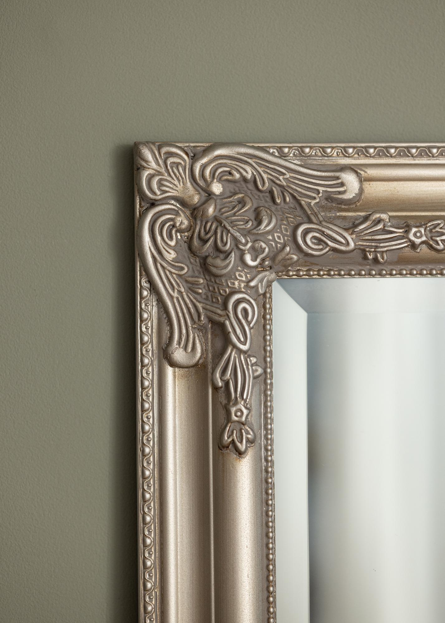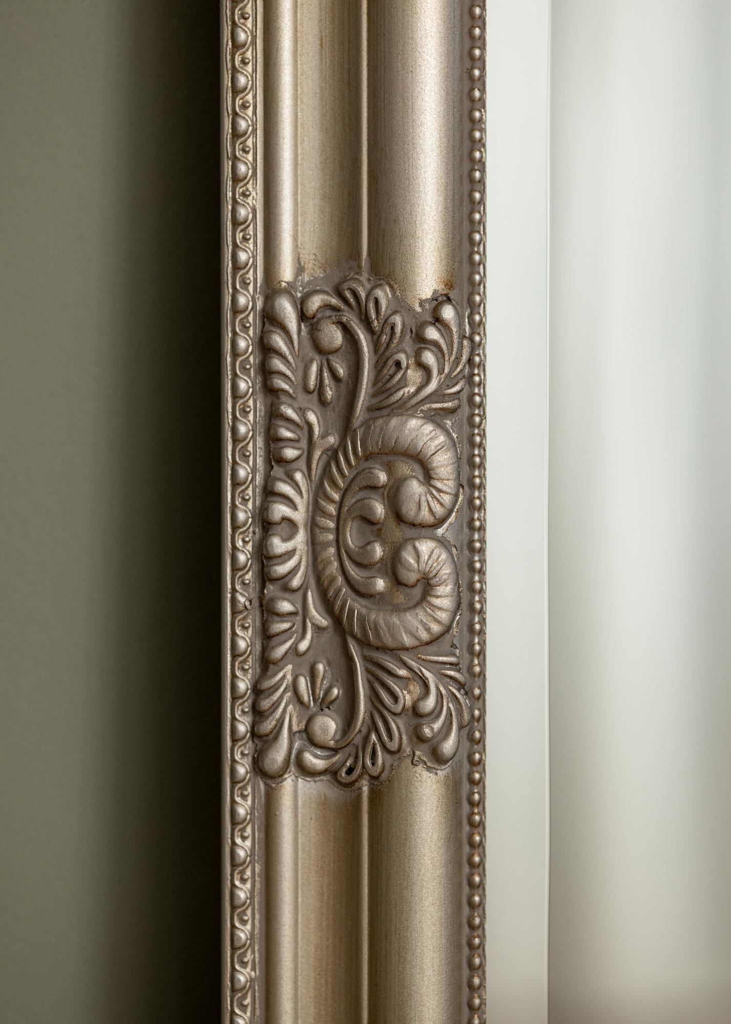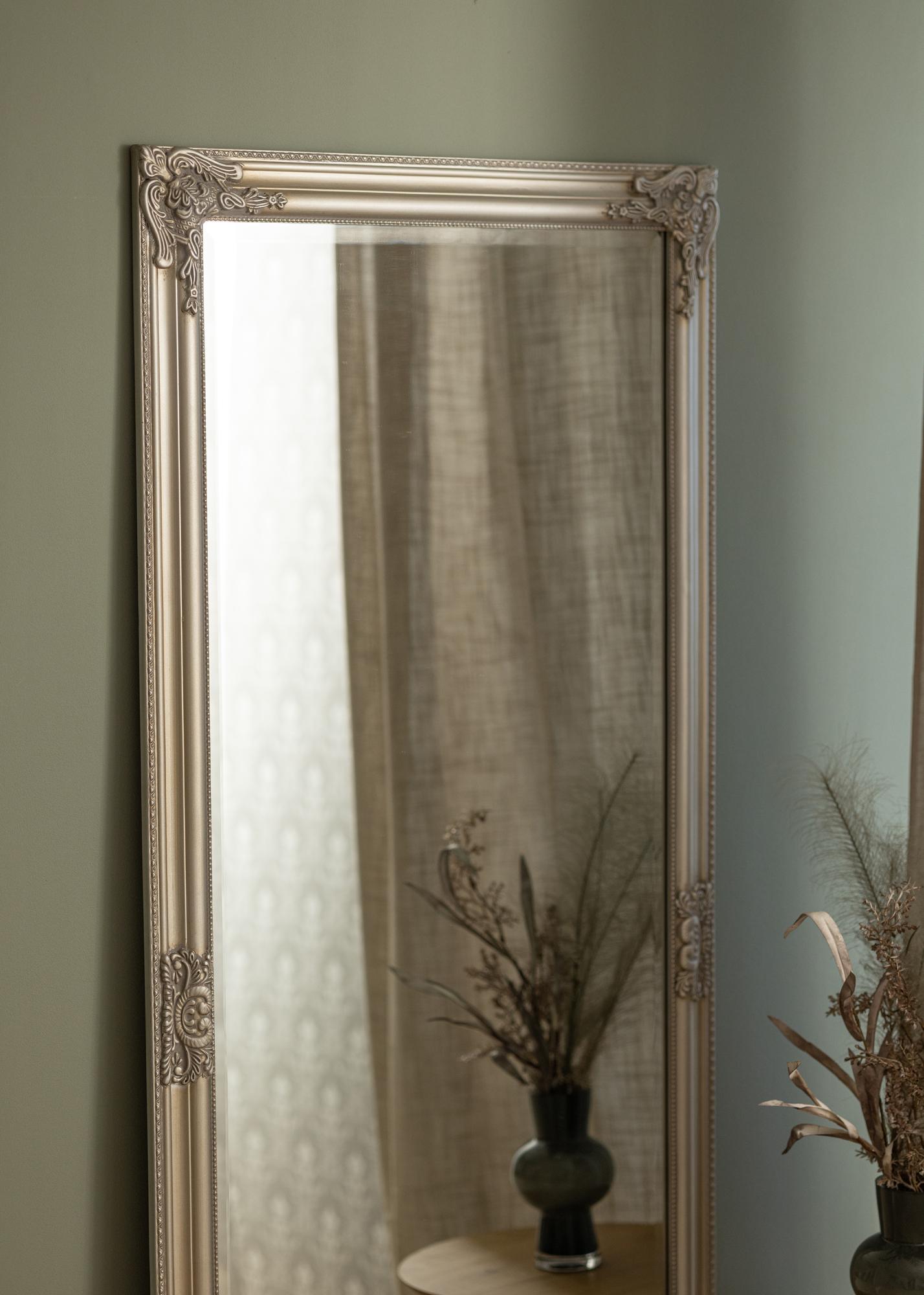 Der reich verzierte Rahmen ist voller feiner Details und Muster, die dem Spiegel einen Vintage-Charme verleihen, dem man nur schwer widerstehen kann. Der silberne Rahmen verstärkt die glänzende Oberfläche des Spiegels und sorgt für eine luxuriöse Atmosphäre im Raum. Dieser Spiegel ist der ideale Begleiter für alle, die klassische Eleganz schätzen und eine raffinierte und einladende Umgebung schaffen möchten.