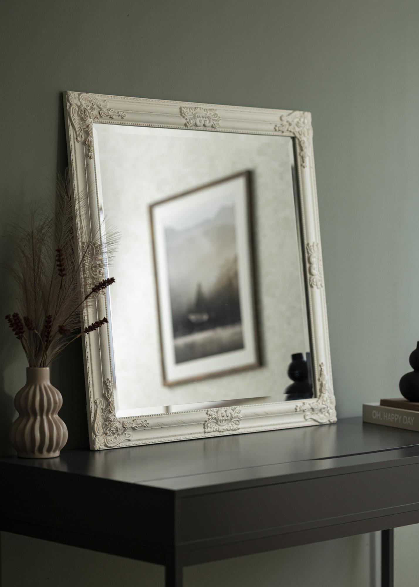 Entdecken Sie den eleganten, quadratischen Spiegel in der Größe von 80x80 cm, der sowohl funktional als auch dekorativ in Ihrem Zuhause ist. Dieser Spiegel hat eine quadratische Form, die eine symmetrische und ausgewogene Atmosphäre schafft und ihn zu einem Blickfang in jedem Raum macht. Der weiße Rahmen ist mit klassisch inspirierten Details verziert und verleiht einen zeitlosen Charme und Eleganz.
