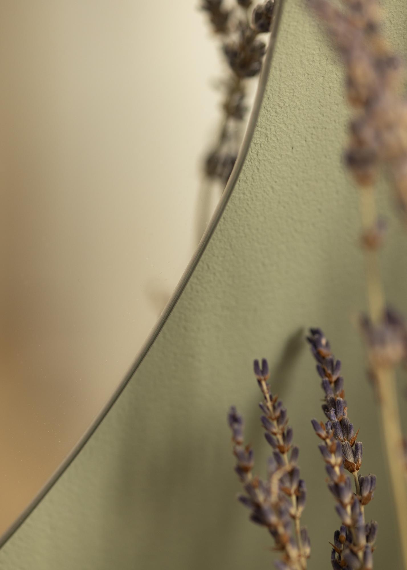 Der Spiegel hat eine runde, eiförmige Kontur mit einem flachen Boden, was eine weiche und moderne Ästhetik bietet. Seine einzigartige Form macht es zu einem Blickfang und einem interessanten Gesprächsstarter. Es ist nicht nur ein Spiegel, sondern auch ein Kunstwerk, das Ihr Zuhause verschönert.