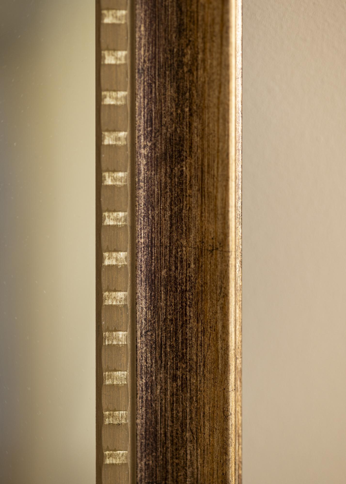Ein dekorativer innerer Rand ist mit kleinen, regelmäßigen goldfarbenen Details verziert. Diese schaffen einen eleganten Kontrast zu dem dunkleren Holzton und fügen eine zusätzliche Dimension der Raffinesse hinzu. Der äußere Rand hat eine weiche Abschrägung mit einem dezenten Gold-Finish, was dem Rahmen ein luxuriöses und zeitloses Gefühl verleiht, das nie aus der Mode kommt.