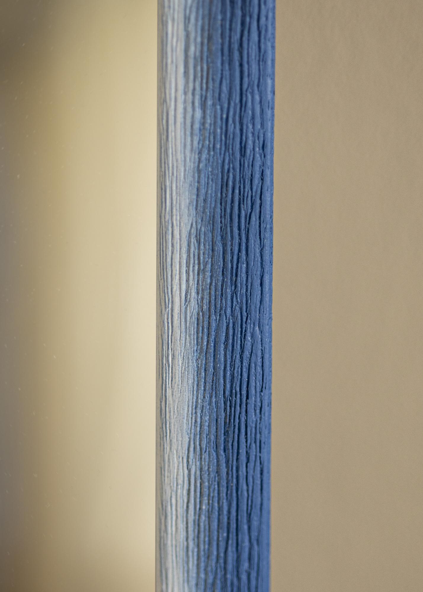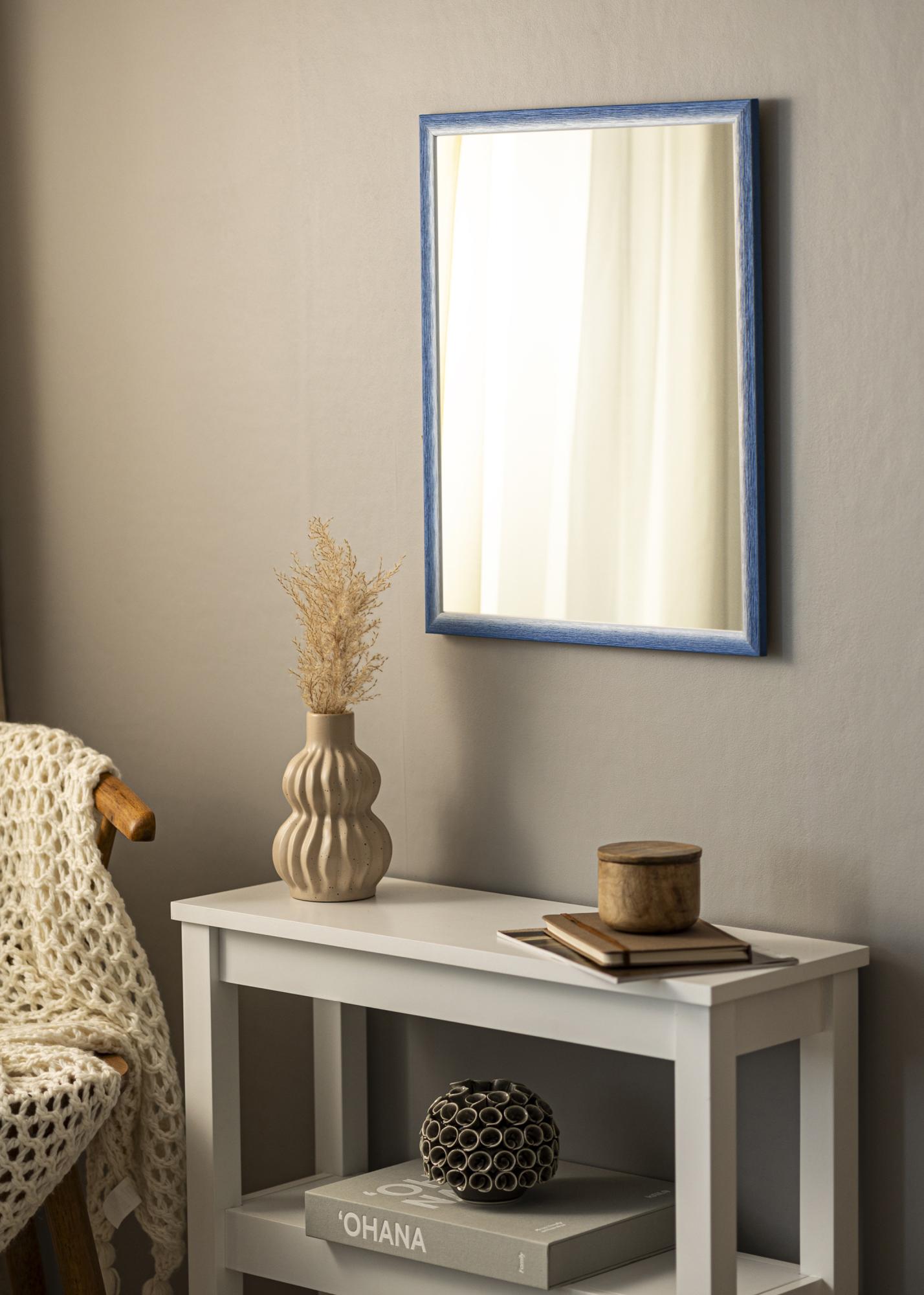 Dieser Spiegel hat eine lebendige Farbskala, die von einem hellen, fast weißen Ton bis zu einem tieferen Blau reicht. Diese Farbvariation verleiht dem Spiegel ein dynamisches Aussehen, das sich je nach Licht im Raum verändern kann. Die Oberfläche hat eine deutliche Holzstruktur mit vertikalen Maserungen, die ein natürliches und taktiles Gefühl bieten. Der Übergang zwischen den verschiedenen Schattierungen ist weich und verleiht dem Rahmen einen handgemalten, einzigartigen Ausdruck.