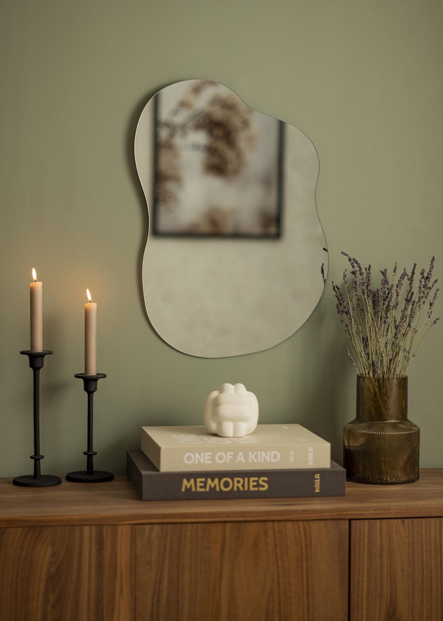 Der Spiegel Curvy Cloud ist ein eleganter Wandspiegel in außergewöhnlichem, asymmetrischem Design. Die Kantenführung zeichnet sich durch die fließend- weiche, runde, wogen- bzw. wolkenartige Formgebung aus. Dieser unkonventionelle Wandspiegel kommt ohne Rahmen aus, was ihm einen minimalistischen Charakter verleiht, den eleganten Ausdruck jedoch in keiner Weise reduziert. Auch das flach gehaltene, nur 4 mm dünne Spiegelglas trägt zur Eleganz des Spiegels bei. Mit Hilfe der Halterungen auf der Rückseite kann der Spiegel einfach an der Wand befestigt werden.
