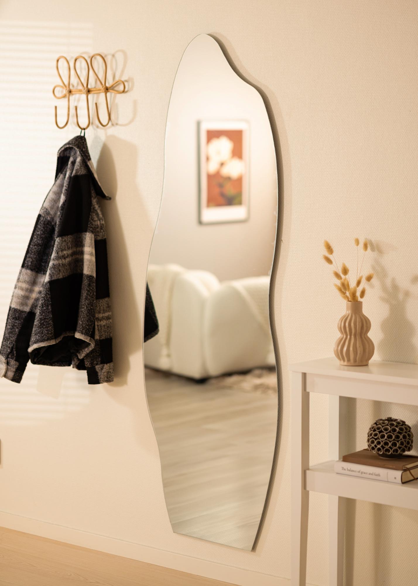 Der Spiegel hat eine einzigartige, wellenähnliche Form, die an der Basis breit ist und elegant nach oben schwingt. Diese ungewöhnliche Form macht ihn zu einem Kunstwerk für sich und verleiht Ihrer Wand eine dynamische Note. Er ist dafür gestaltet, ein zentraler Punkt in Ihrem Zuhause zu sein, egal, ob er im Flur, Schlafzimmer oder Wohnzimmer platziert wird.