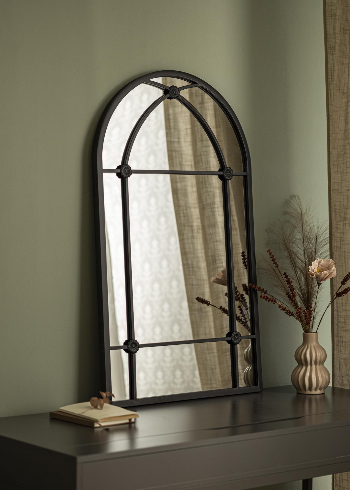 Mit seiner bogigen Silhouette und dem detailreichen Eisenarbeiten erinnert der Spiegel an klassische Fenster, die dem Raum Tiefe und Weite verleihen. Er ist nicht nur ein praktischer Gegenstand für den täglichen Gebrauch, sondern auch eine künstlerische Einrichtungsdetail, das den Blick einfängt und zur Atmosphäre des Raumes beiträgt.