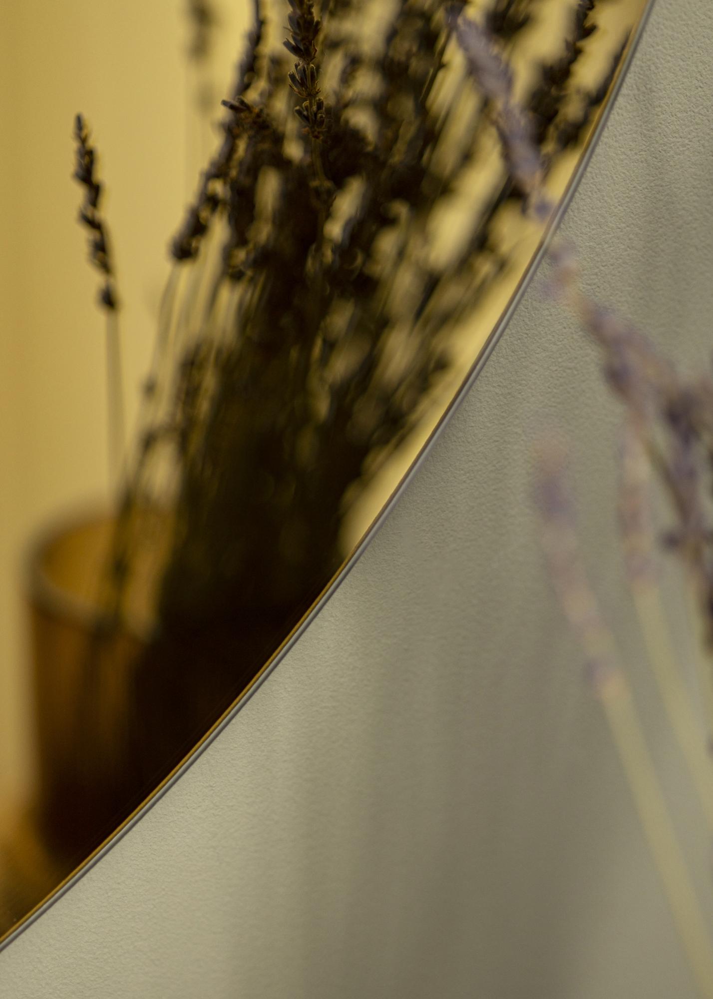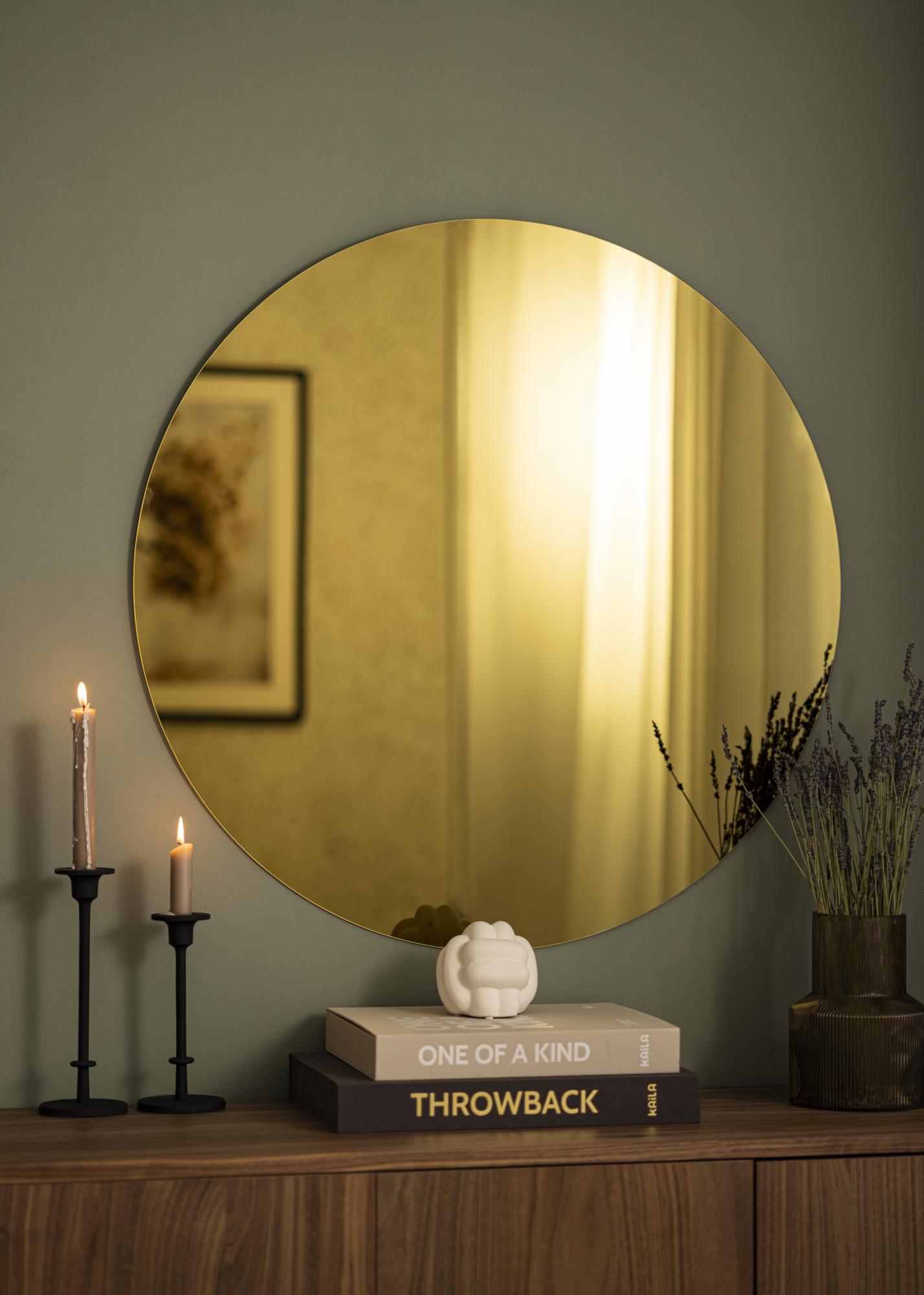 Dieser elegante, minimalistisch anmutende Wandspiegel rund mit goldgelb getöntem Farbton wirkt ausgefallen und klassisch zugleich. Das dünne, goldgelb getönte Spiegelglas fasziniert mit einem ganz eigenen Ausdruck, der trotzdem schlicht, sanft und diskret daherkommt. Die stilsichere runde Spiegelform harmoniert sehr schön mit dem dünnen Spiegelglas sowie der ungewöhnlichen Farbgebung.