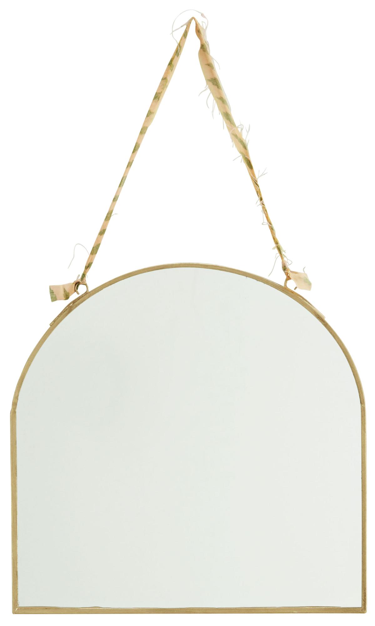 Bogenförmiger Spiegel von Madam Stoltz mit Rahmen in Messingfarbe. Der Spiegel wird mithilfe eines Baumwollbands aufgehängt, was ihm einen Bohemian-Style verleiht, der perfekt sowohl in Wohn- wie auch Schlafzimmer passt. Dieser Wandspiegel hat die Maße 23×23 cm. Dank seiner zierlichen Größe lässt sich dieser Wandspiegel hervorragend mit anderen Spiegelmodellen kombinieren.