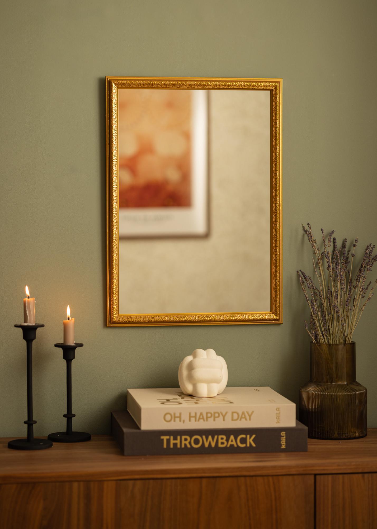 Wenn Sie auf der Suche nach einem luxuriösen goldfarbenen Spiegel sind, können Sie jetzt aufhören zu suchen. Nostalgia Gold ist ein Wandspiegel mit einem 2,8 cm breiten Rahmen mit eleganter Profilierung und einem schönen dekorativen Muster. Das Spiegelglas wird das Licht in Ihrem Raum reflektieren, während der Spiegel selbst zu einem stilvollen Detail an Ihrer Wand wird. Auf der Rückseite befindet sich eine Wandhalterung für eine einfachere Aufhängung.