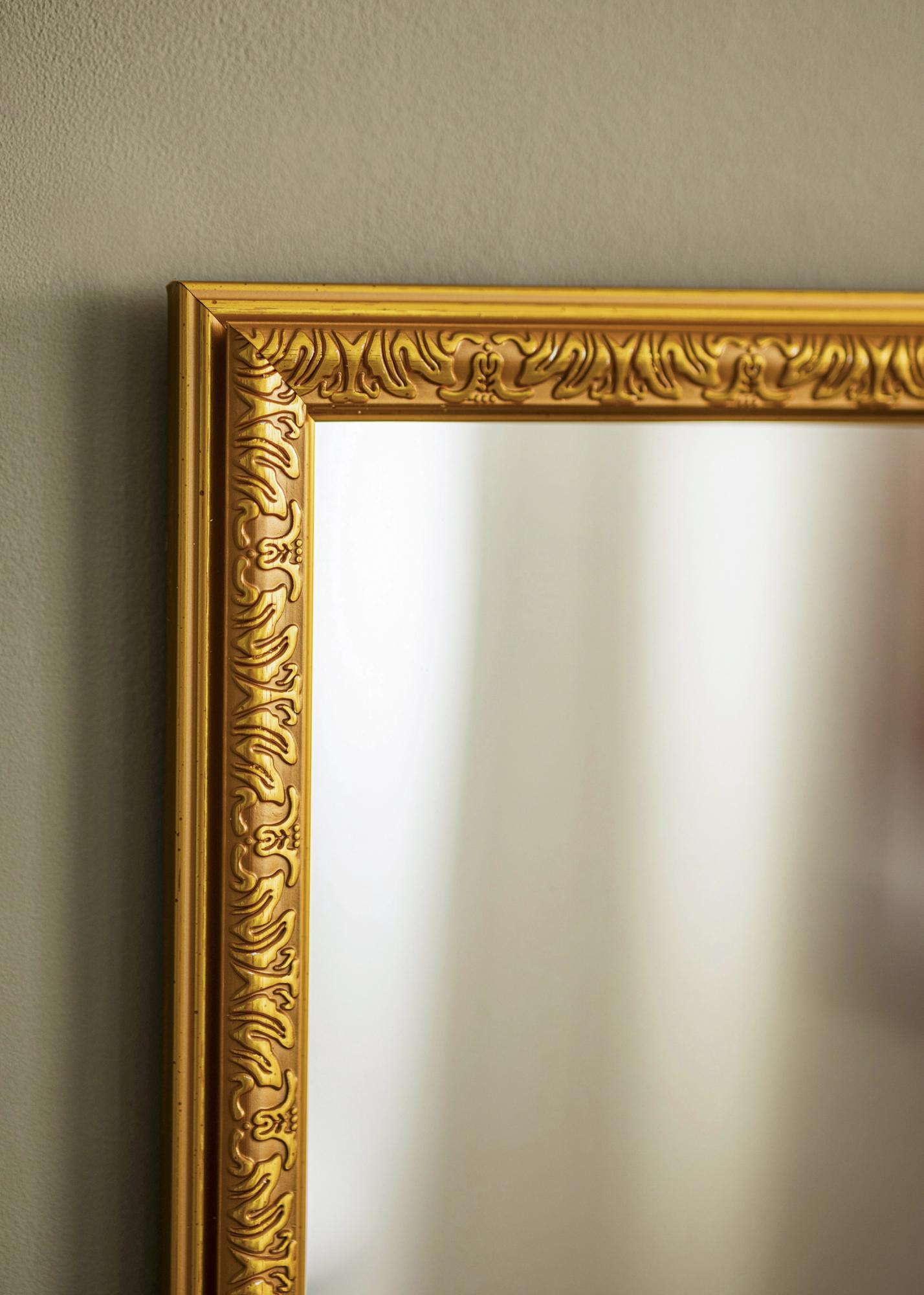 Wenn Sie auf der Suche nach einem luxuriösen goldfarbenen Spiegel sind, können Sie jetzt aufhören zu suchen. Nostalgia Gold ist ein Wandspiegel mit einem 2,8 cm breiten Rahmen mit eleganter Profilierung und einem schönen dekorativen Muster. Das Spiegelglas wird das Licht in Ihrem Raum reflektieren, während der Spiegel selbst zu einem stilvollen Detail an Ihrer Wand wird. Auf der Rückseite befindet sich eine Wandhalterung für eine einfachere Aufhängung.