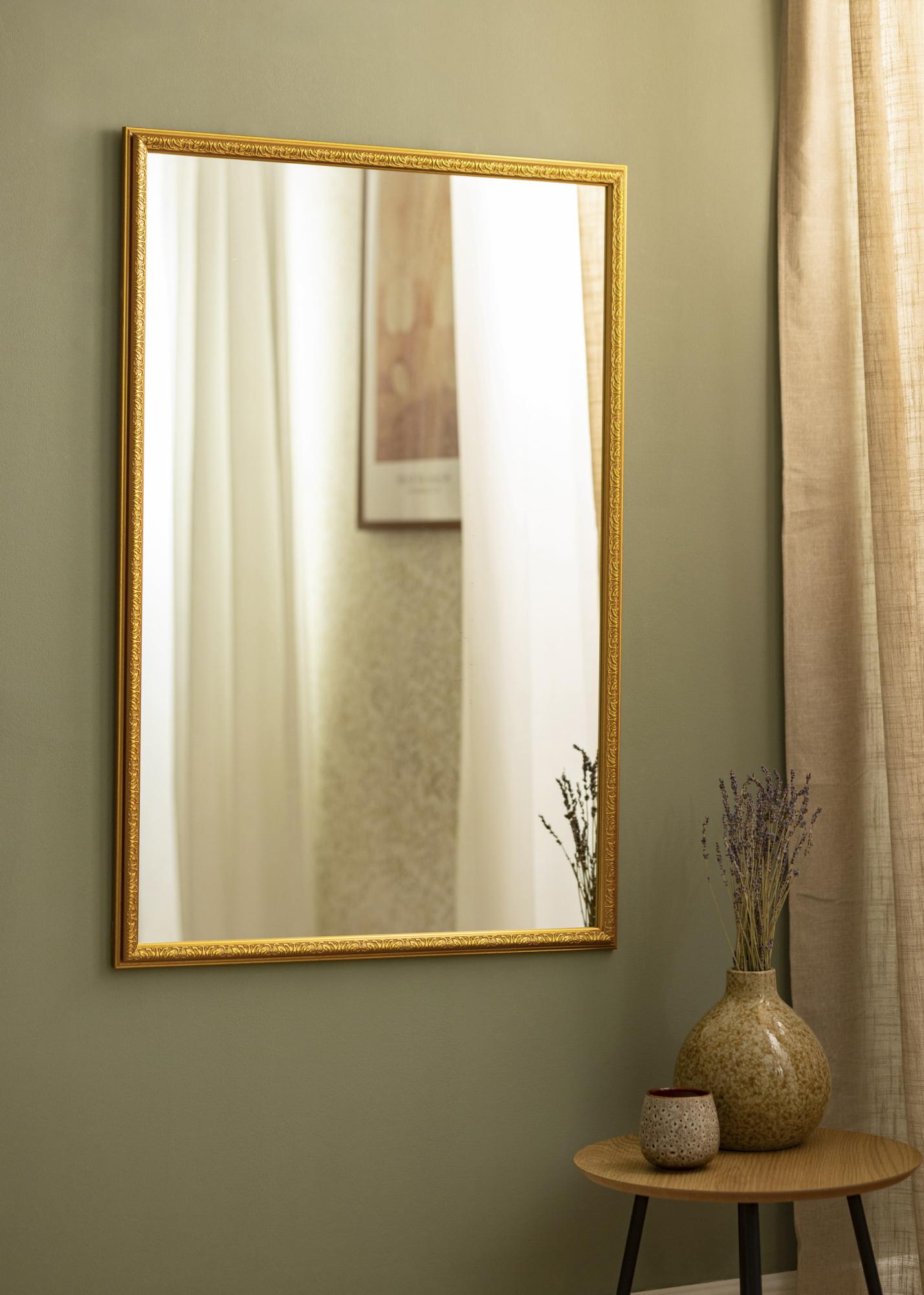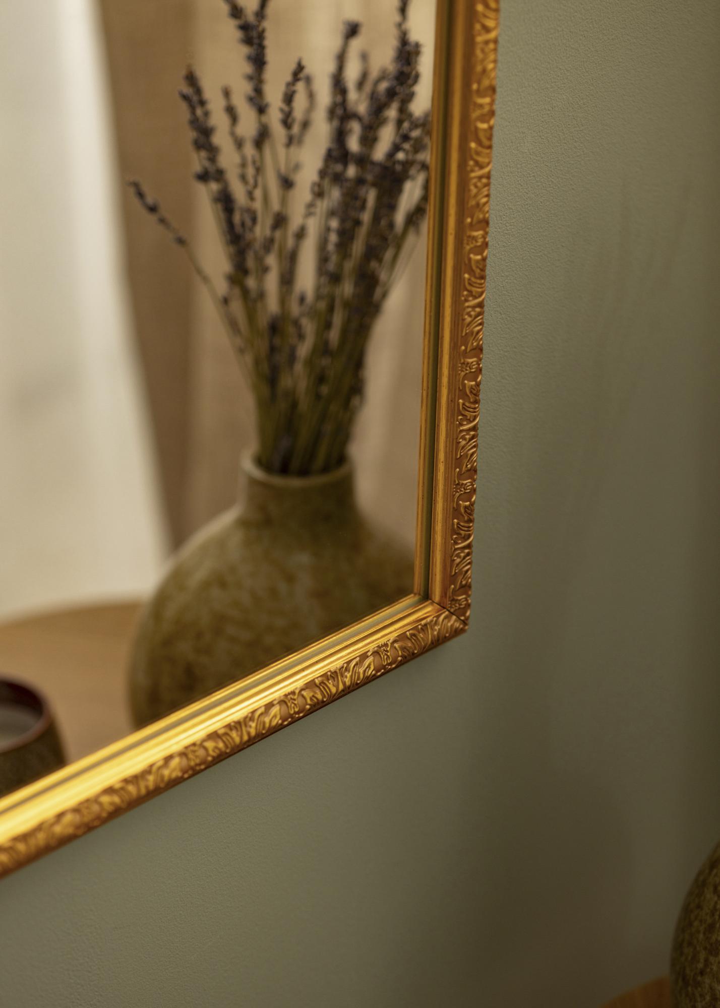 Wenn Sie auf der Suche nach einem luxuriösen goldfarbenen Spiegel sind, können Sie jetzt aufhören zu suchen. Nostalgia Gold ist ein Wandspiegel mit einem 2,8 cm breiten Rahmen mit eleganter Profilierung und einem schönen dekorativen Muster. Das Spiegelglas wird das Licht in Ihrem Raum reflektieren, während der Spiegel selbst zu einem stilvollen Detail an Ihrer Wand wird. Auf der Rückseite befindet sich eine Wandhalterung für eine einfachere Aufhängung.