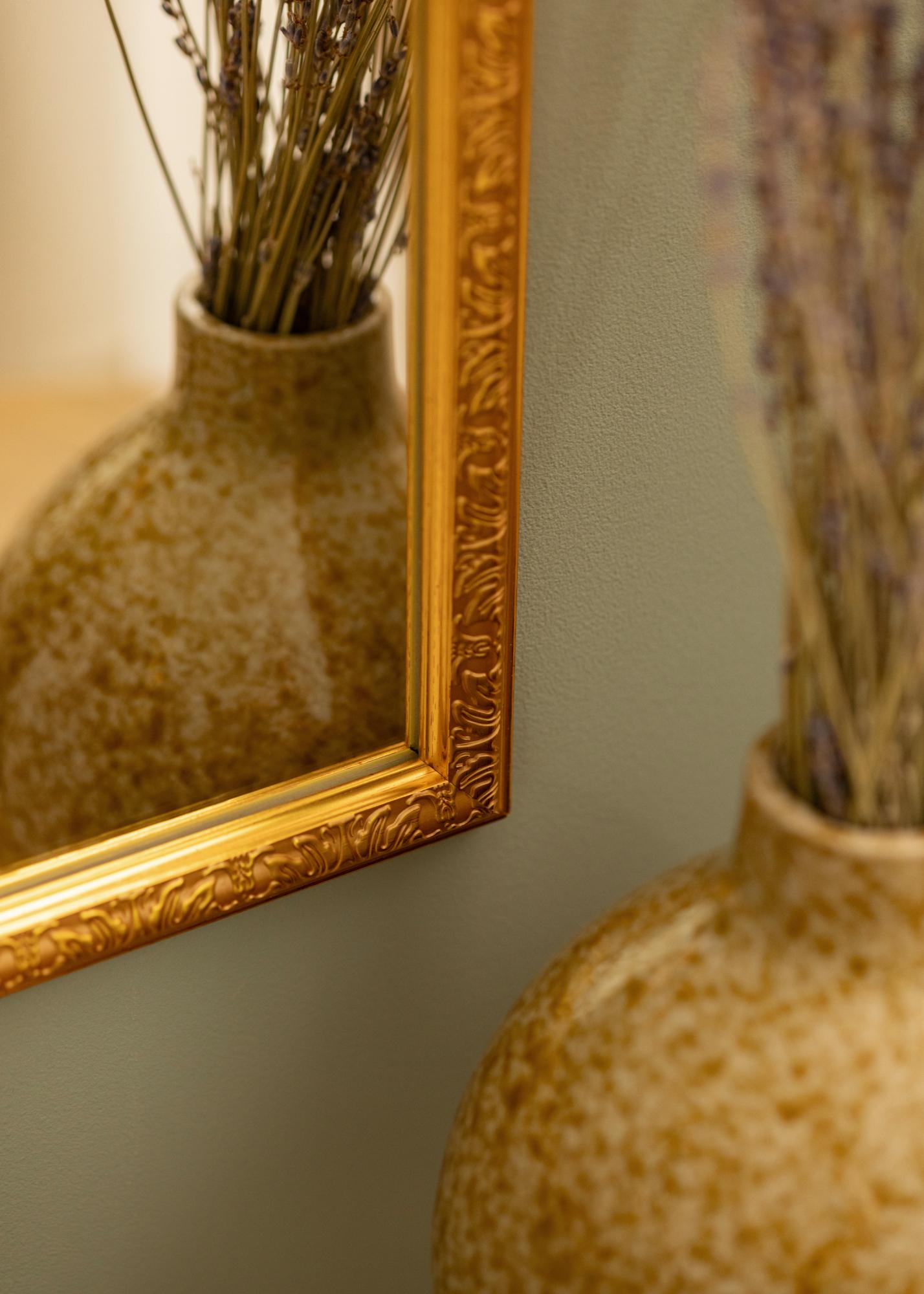 Wenn Sie auf der Suche nach einem luxuriösen goldfarbenen Spiegel sind, können Sie jetzt aufhören zu suchen. Nostalgia Gold ist ein Wandspiegel mit einem 2,8 cm breiten Rahmen mit eleganter Profilierung und einem schönen dekorativen Muster. Das Spiegelglas wird das Licht in Ihrem Raum reflektieren, während der Spiegel selbst zu einem stilvollen Detail an Ihrer Wand wird. Auf der Rückseite befindet sich eine Wandhalterung für eine einfachere Aufhängung.