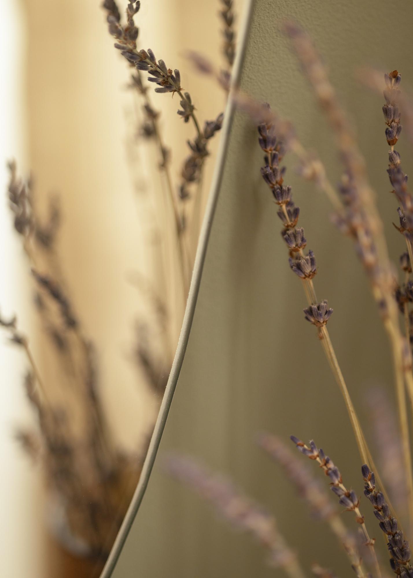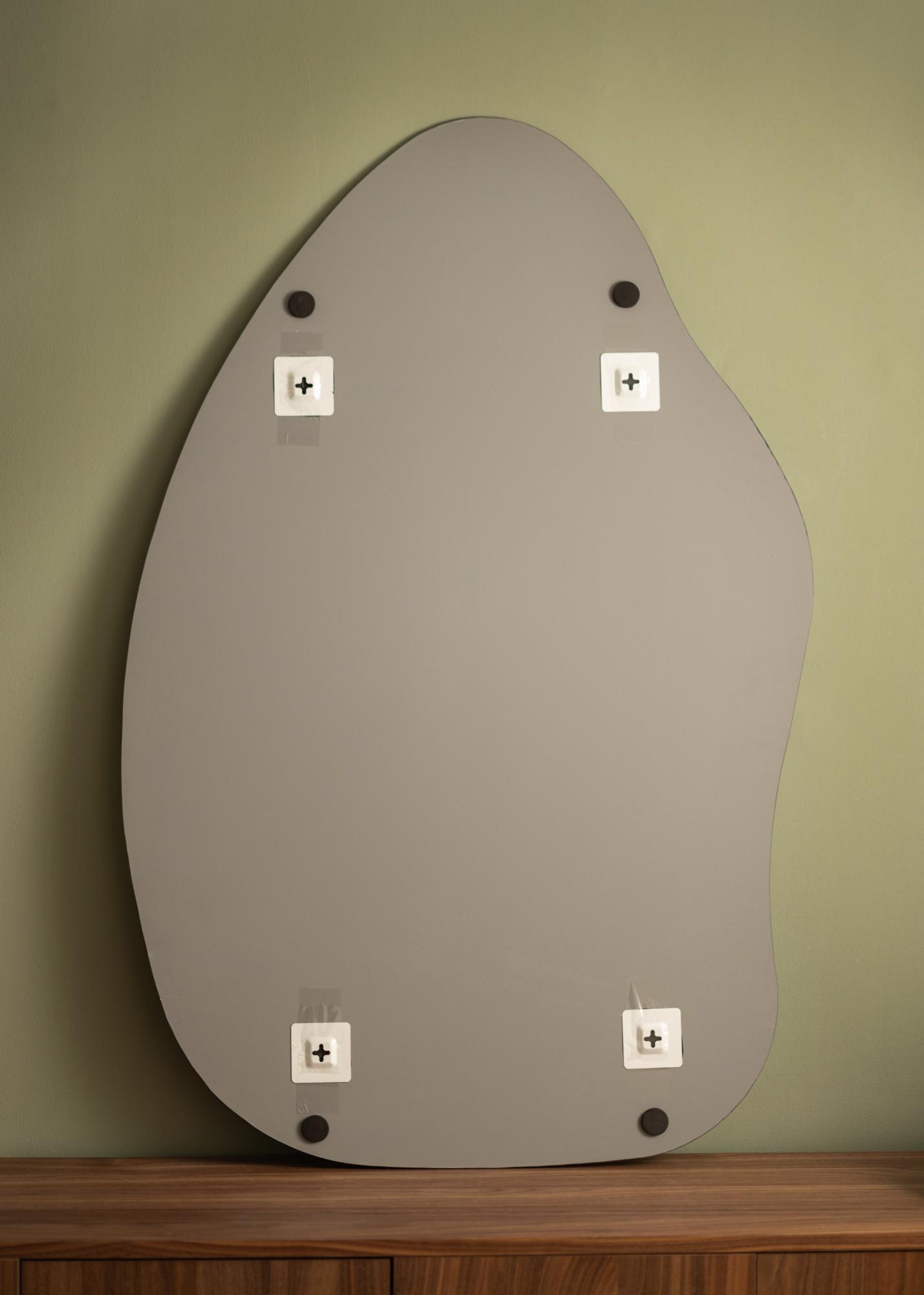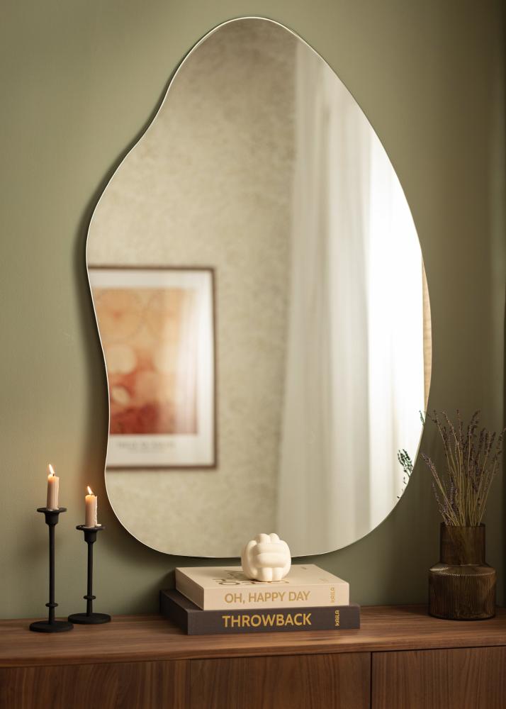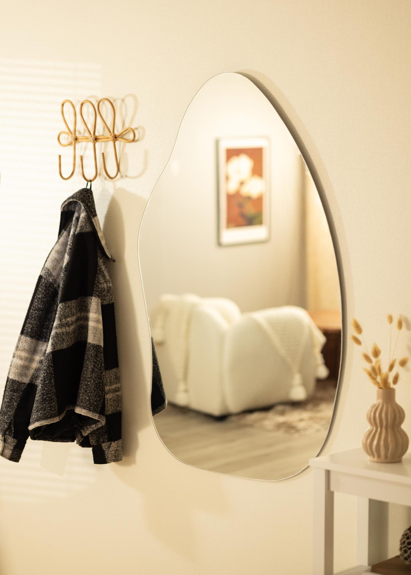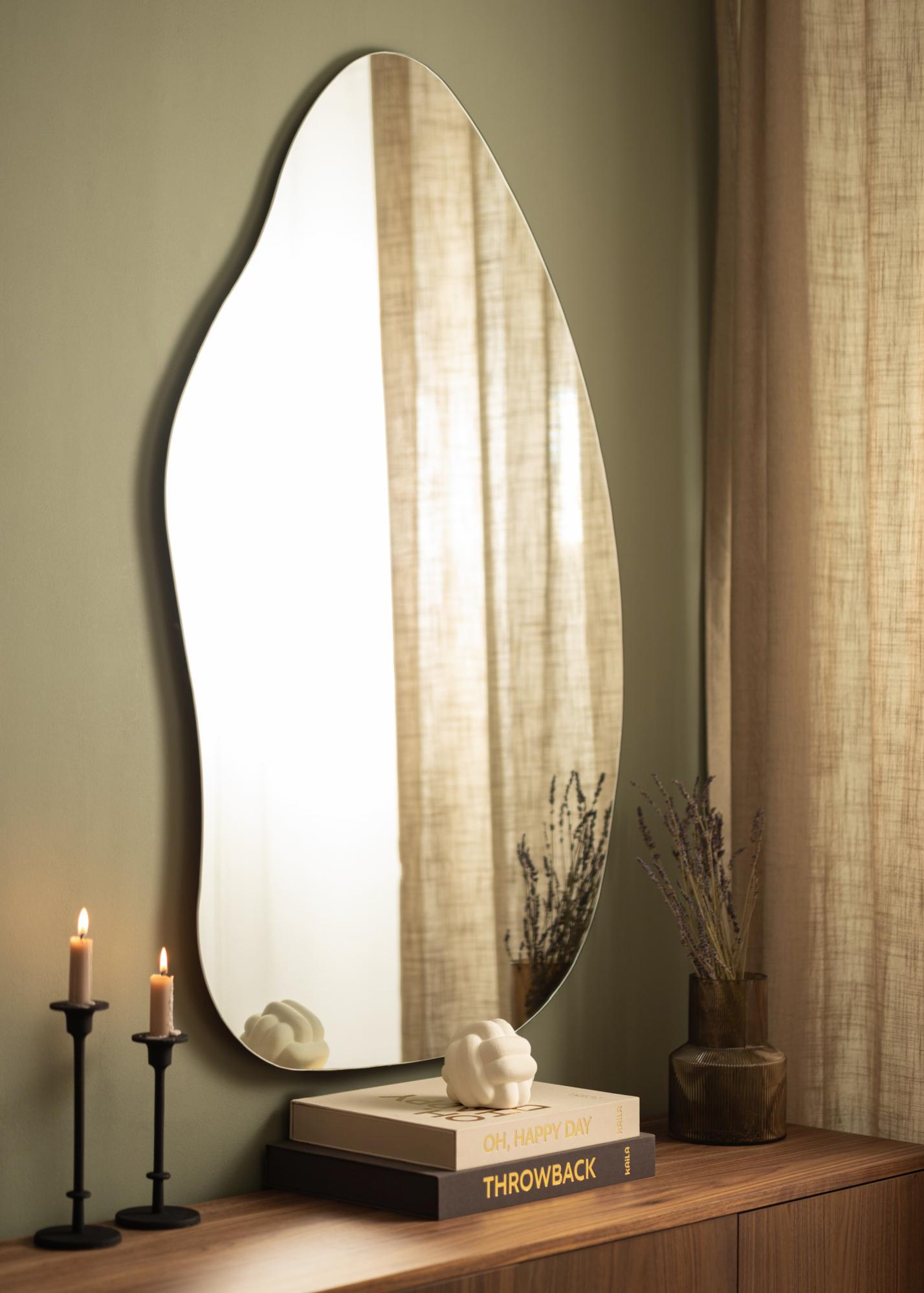 Der Spiegel hat eine weiche und organische Form, die an einen Wassertropfen oder ein aufrecht stehendes Blatt erinnert und dem Raum eine elegante und moderne Atmosphäre verleiht. Diese einzigartige Form macht den Spiegel zu einem Gesprächsthema und einem Kunstwerk für sich, während er gleichzeitig seine praktische Funktion erfüllt.