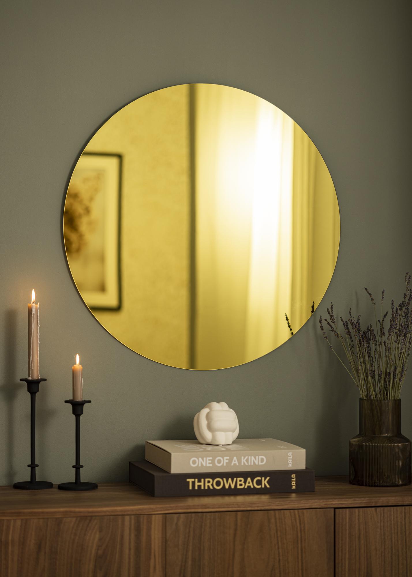 Dieser trendige Wandspiegel macht einen echten Blickfang aus. Ob in Schlafzimmer, Flur oder Wohnzimmer, dieser schöne Wohnspiegel mit gelb getöntem Spiegelglas wirkt als belebender Farbtupfer erfrischend und fröhlich, ohne dabei seinen eleganten, stilvollen Charakter zu verlieren. Durch die flache Ausführung mit dünnem Spiegelglas und dem rahmenlosen Design erhält der Spiegel einen minimalistischen Touch, der ihm ausgesprochen gut steht. Auf der Rückseite des runden Spiegels befinden sich Halterungen für die Aufhängung an der Wand.