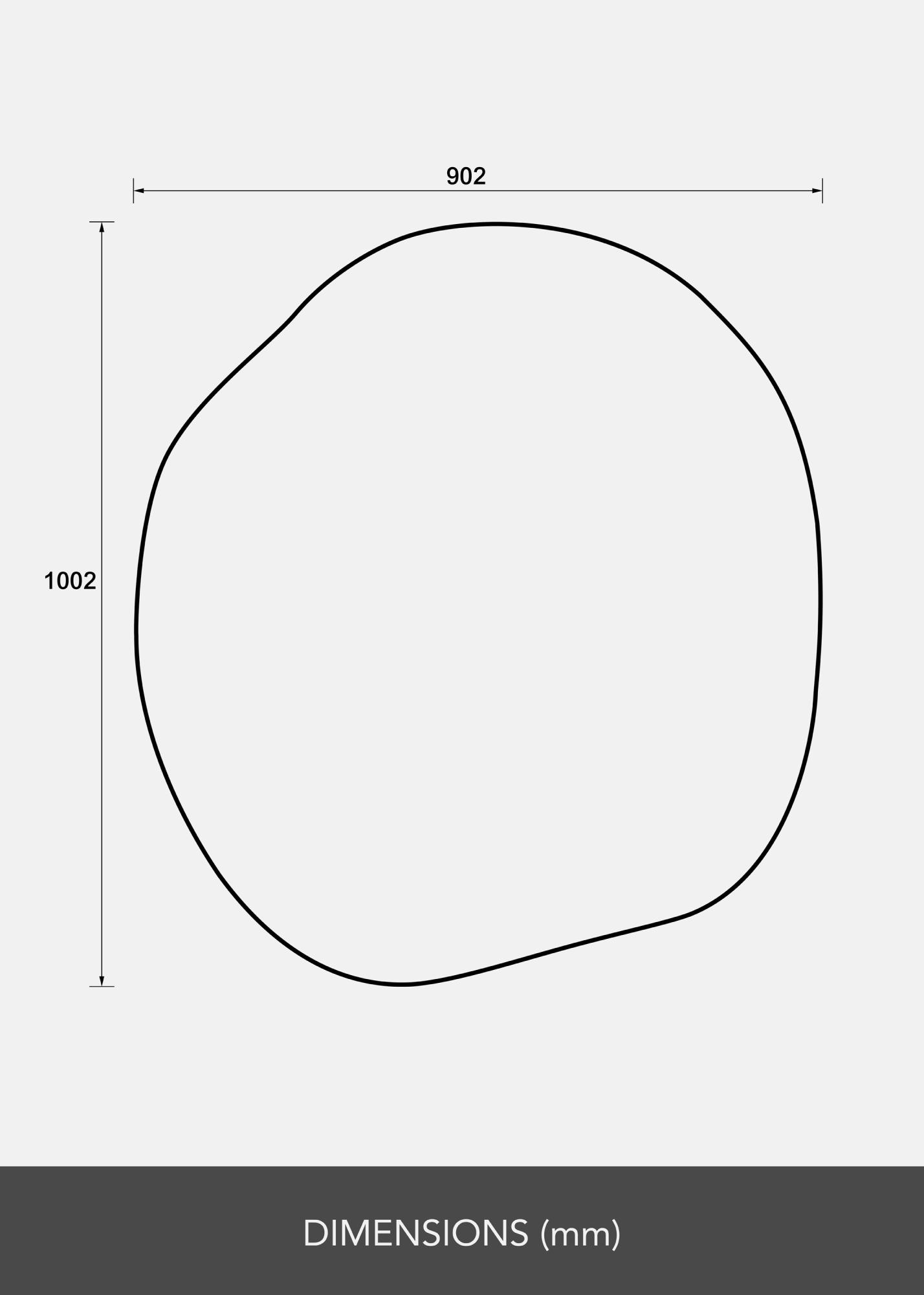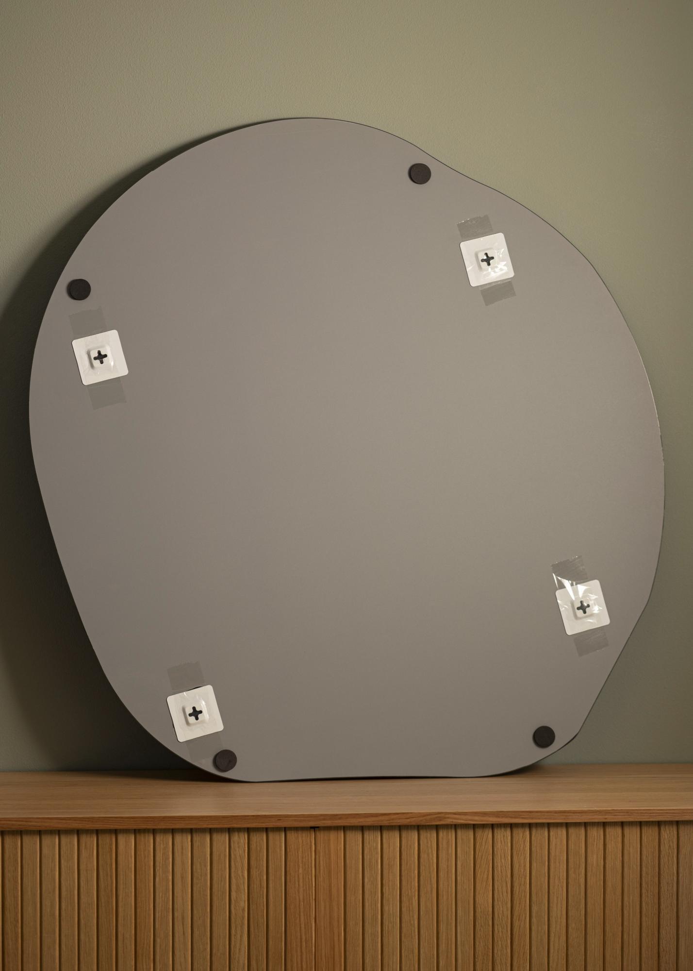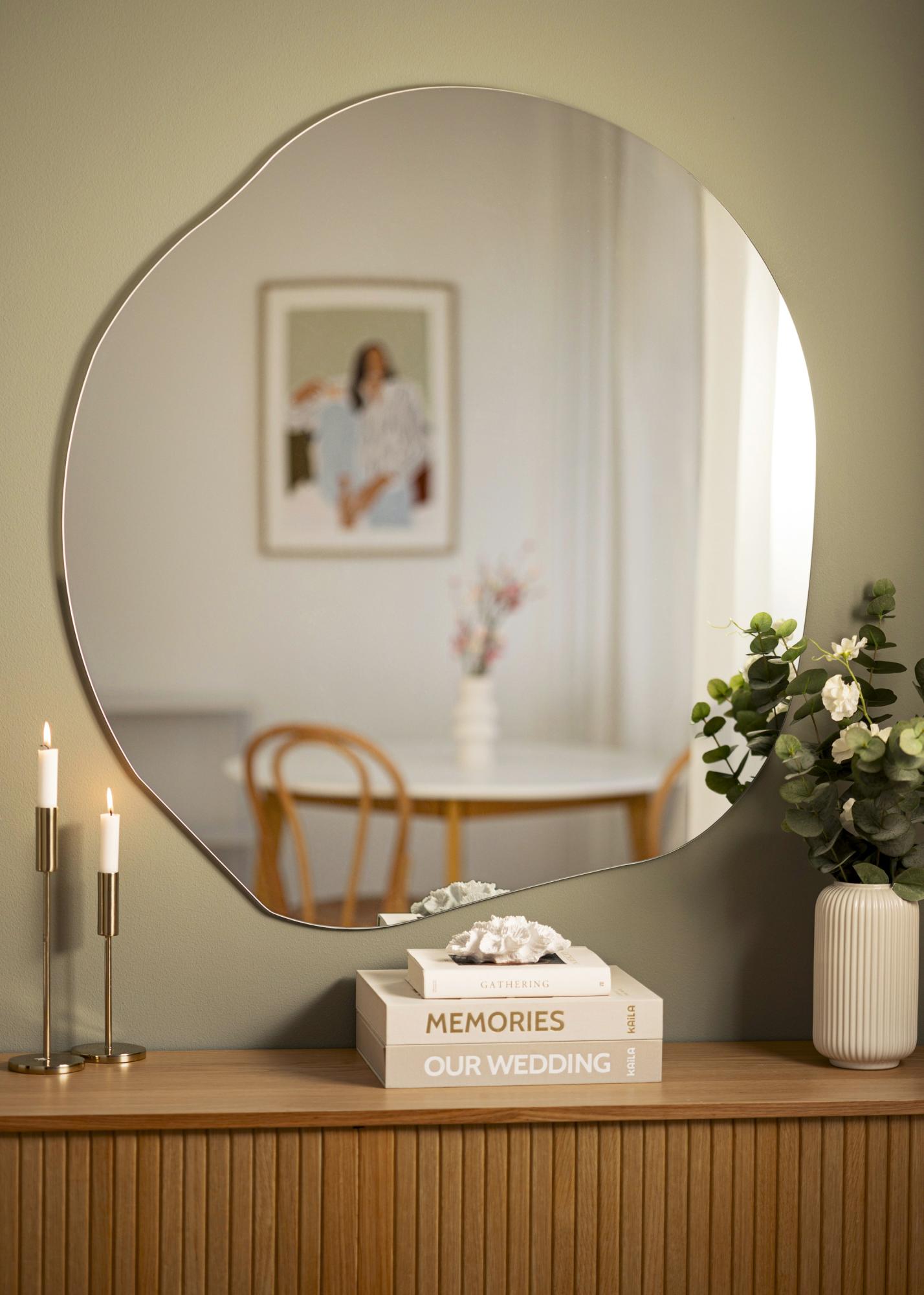 Der Spiegel hat eine abgerundete, fast organische Form mit weichen, fließenden Linien, die eine entspannte und einladende Atmosphäre schaffen. Dieses Design macht den Spiegel zu einem natürlichen Blickfang im Raum und verleiht Ihrer Einrichtung einen Hauch von Eleganz und Sanftheit.