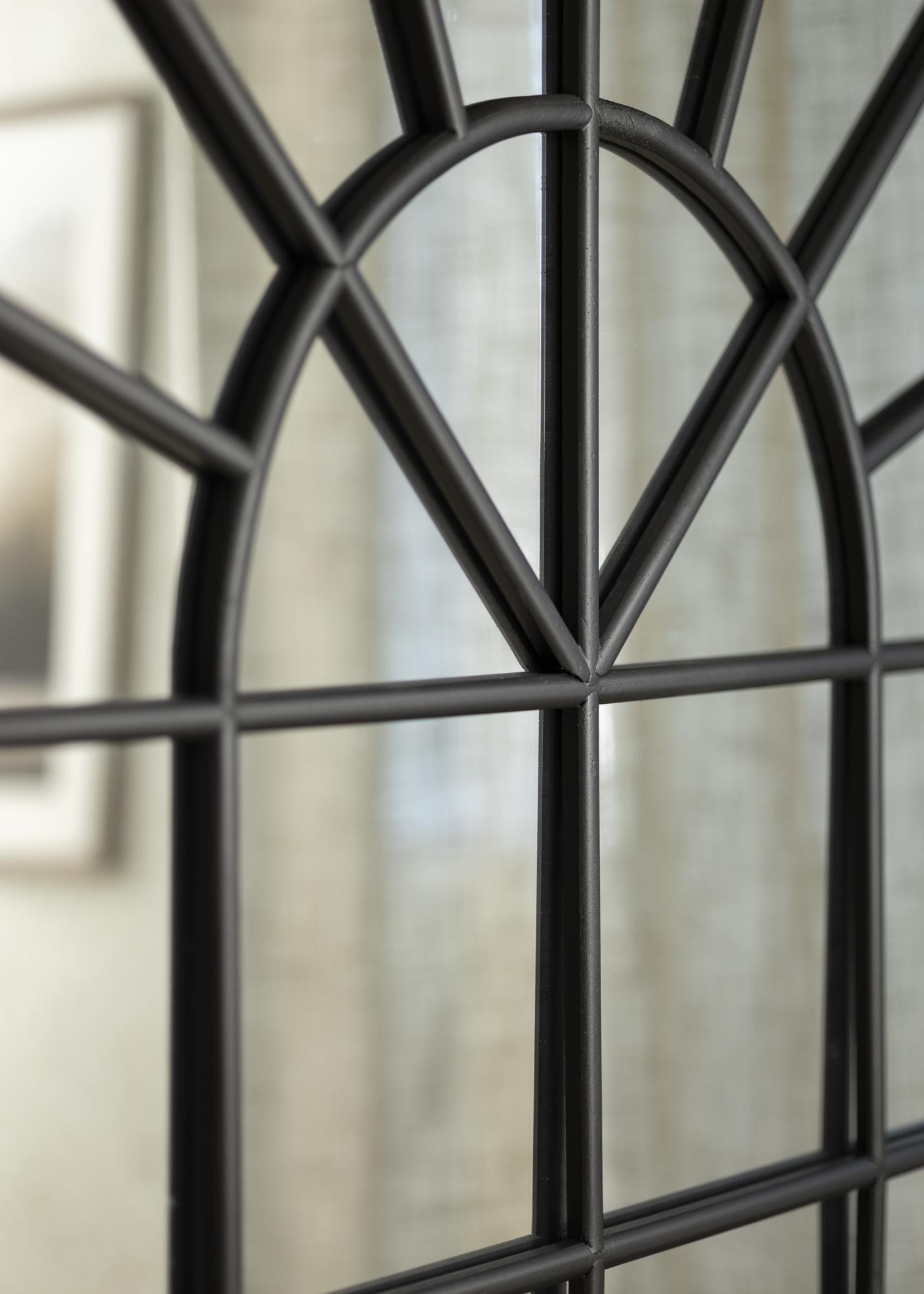 Entdecken Sie die imposante Präsenz unseres einzigartigen Spiegels, ein wahrer Hingucker für jeden Raum. Mit seinen großzügigen Maßen von 103x180 cm bietet dieser Spiegel nicht nur eine praktische Funktion, sondern wird auch Teil Ihrer Einrichtung. Seine beeindruckende halbrunde Bogenform oben wird durch ein fesselndes fensterähnliches Raster ergänzt, das dem Spiegel eine markante industrielle Ästhetik verleiht.