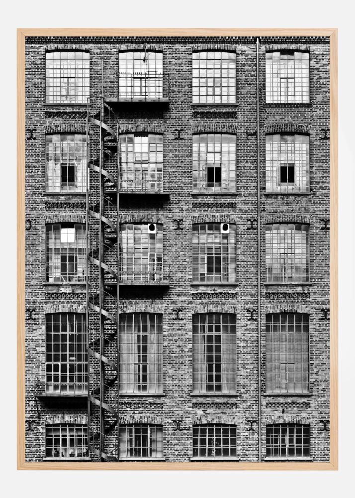 Ein urbanes Poster, das die Fassade eines alten Gebäudes mit einer gewundenen Wendeltreppe zeigt. Die dramatischen quadratischen Fenster stehen im Kontrast zu den Kurven der Treppe. Dieser Druck eignet sich hervorragend für geometrische Formen
