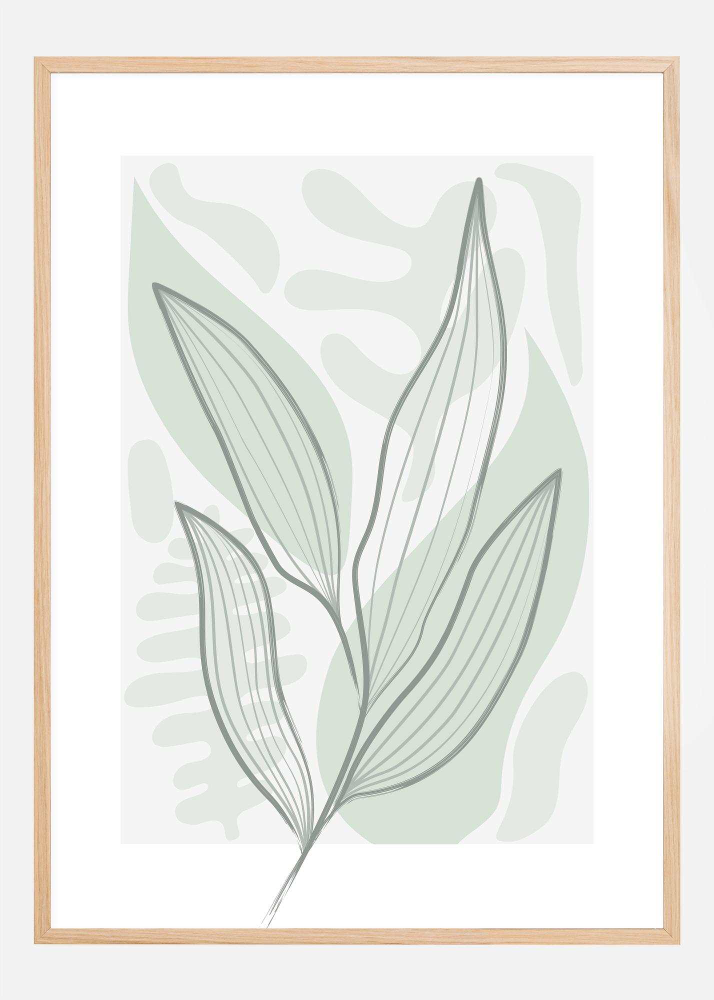 Ein abstraktes Poster mit Blättern auf einem einfachen grünen Hintergrund mit verschiedenen Blattformen und -designs. Das schlichte Blattdesign in sanften Grün- und Grautönen, umrandet von einer kräftigen grauen Linie, verströmt kräftige Frühlingsgefühle, die sich in jedem Raum des Hauses gut einfügen lassen.