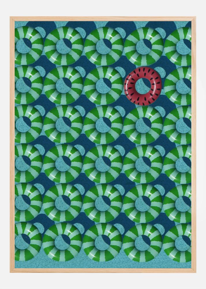 Dieses verspielte und farbenfrohe Poster ist eine Hommage an Individualität und Originalität. In einem Meer aus identischen grünen und weißen Schwimmreifen zieht ein einzelner Wassermelonen-Schwimmreifen die Blicke auf sich und vermittelt ein sofortiges Gefühl von Freude und Spaß. Dieses Print ist ein perfekter Sommerbegleiter, der das Einzigartige daran hervorhebt, aus der Menge herauszustechen.