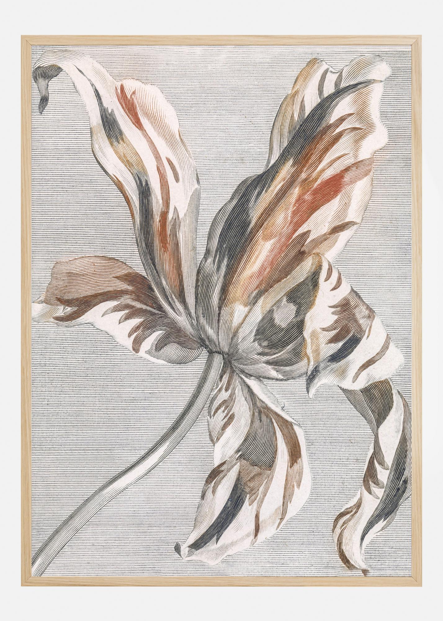 Ein florales Poster mit einer kühn gestreiften Blume in Rot, Weiß und Grau. Die fließenden Pinselstriche folgen den Linien der Blütenblätter und bringen Leben in das Bild. Passen Sie die kräftigen Rottöne der Wand, an der Sie das Poster aufhängen, an, um einen noch lebhafteren Effekt zu erzielen.