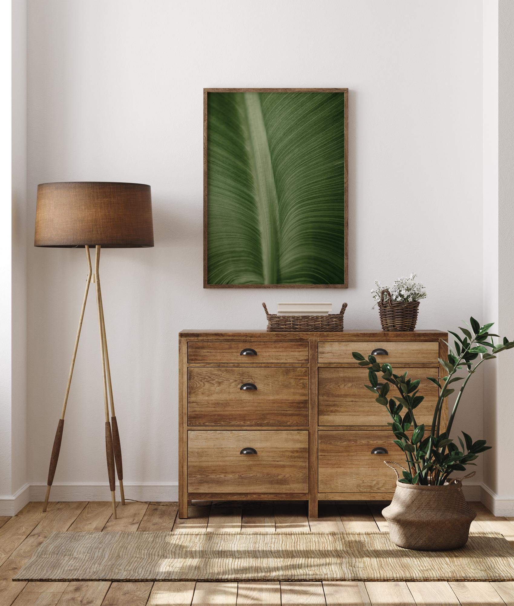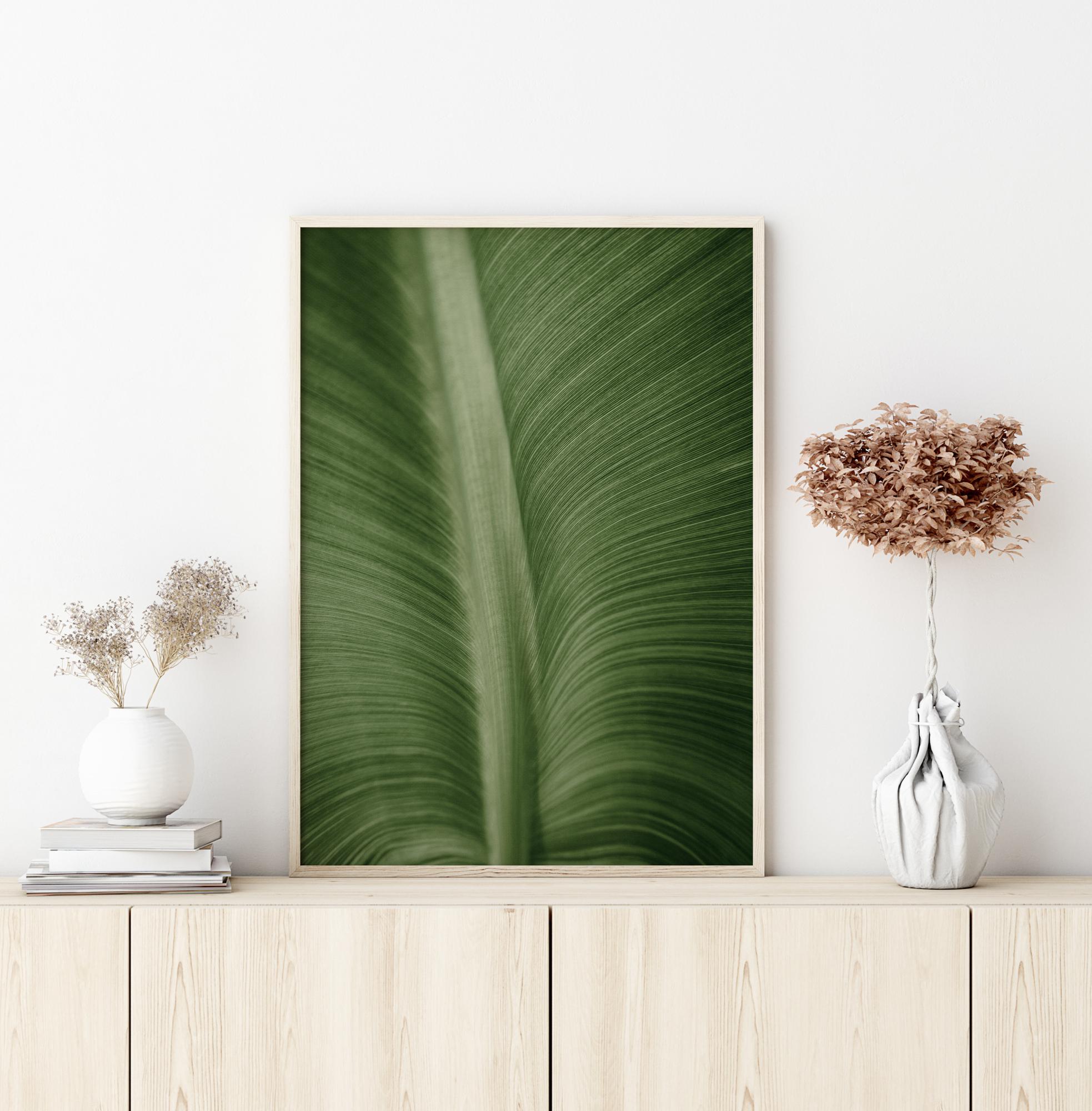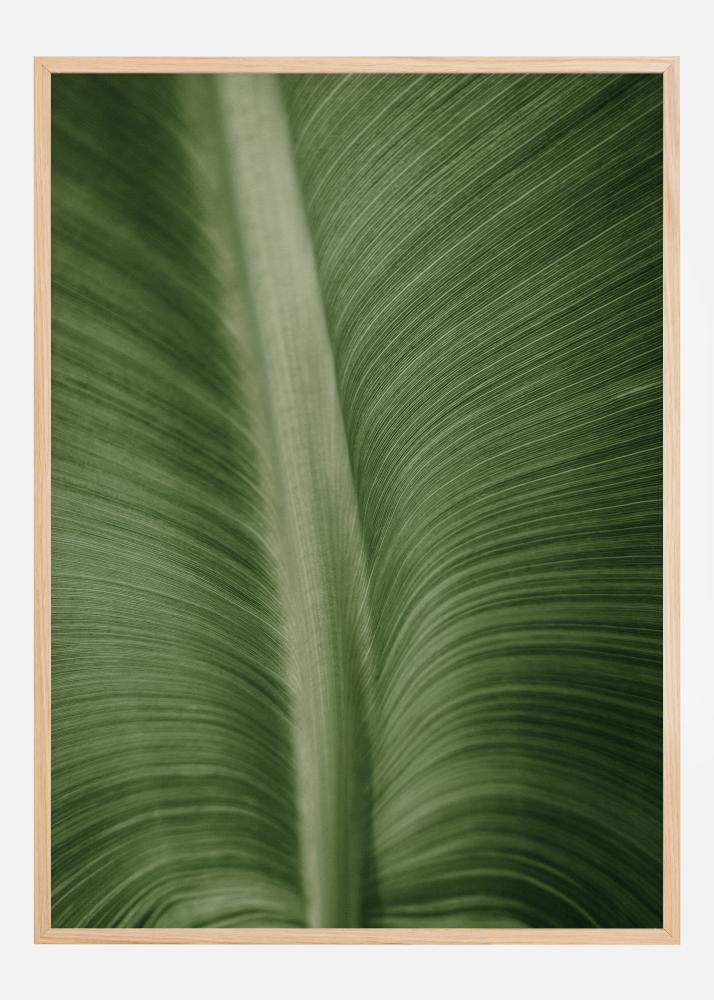 Ein Makro-Poster eines Blattes, das die Struktur der Adern und Rippen zeigt. Ein wunderschönes, sattes Grün füllt dieses Bild und sorgt für einen sehr beruhigenden Effekt. Die dünnen Adern wölben sich sanft nach außen, weg von der dicken, kräftigen Mittelrippe des Blattes. Tauchen Sie mit dieser Nahaufnahme in die Natur ein.