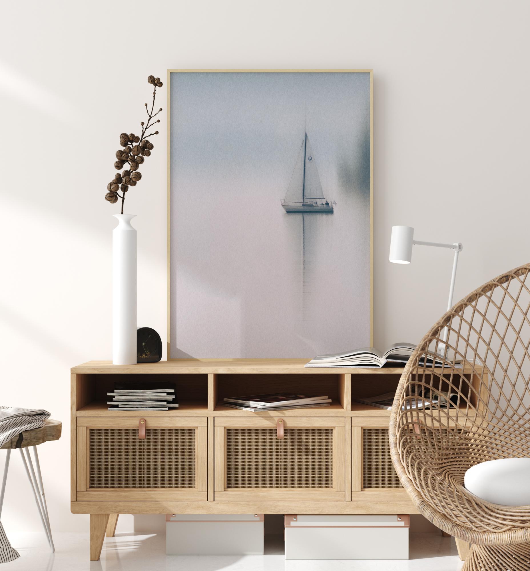 Ein beruhigendes Poster einer Jacht inmitten eines blassweißen Sees. Das Bild ist weich, mit unscharfen Rändern für alle Gestalten. Mit langgestrecktem Segel gleitet das Bootes auf dem Wasser in den blassblauen und grauen Dunst eines frühen Sonntagmorgens.