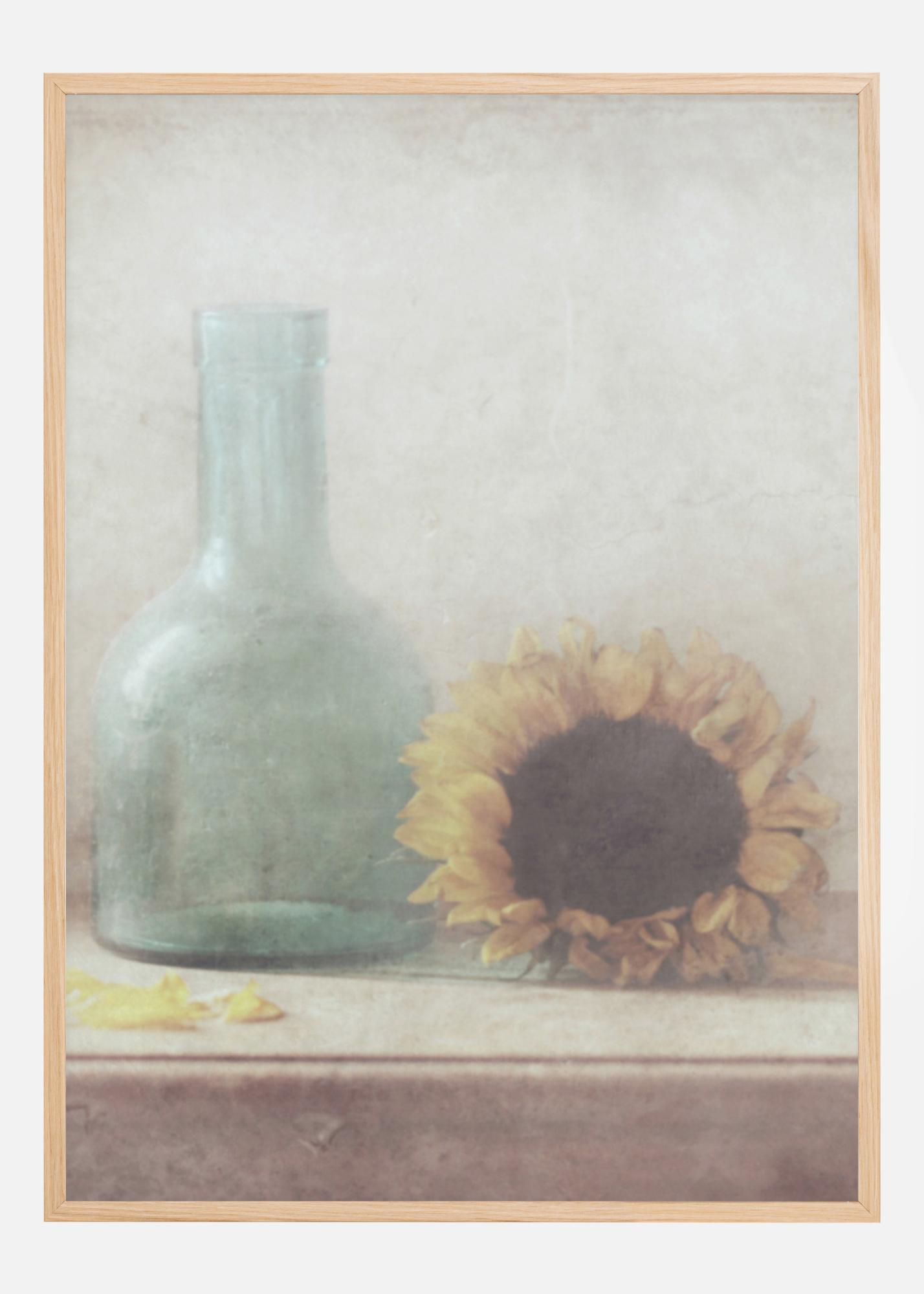 Ein klassisches Poster mit einer Glasflasche und dem Kopf einer Sonnenblume. Dieses Stillleben ist in eine weiche Unschärfe gehüllt und wirkt sanft und friedlich. Die gelben Blütenblätter kräuseln sich sanft, während der Blumenkopf auf dem Regal ruht. Fügen Sie dieses zarte Pastellbild einer neutralen Wand hinzu, um einen beruhigenden Effekt zu erzielen.