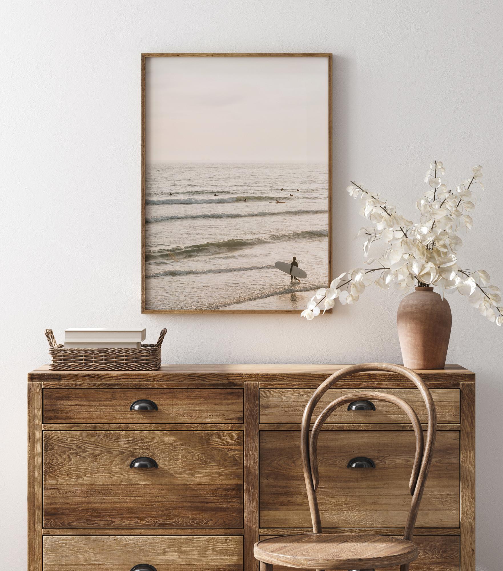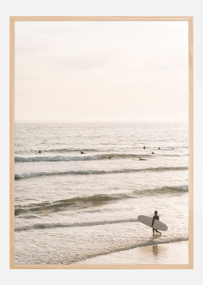 Ein Meeresposter mit einer weiten Meeresfläche voller Surfer, die auf die nächste große Welle warten. Kleine Köpfe wippen weit draußen im Ozean, während ein letzter Surfer mit seinem Brett in die Brandung schlendert. Das Meer ist ruhig im sanften Morgenlicht und es liegt ein Gefühl der Vorfreude in der Luft.
