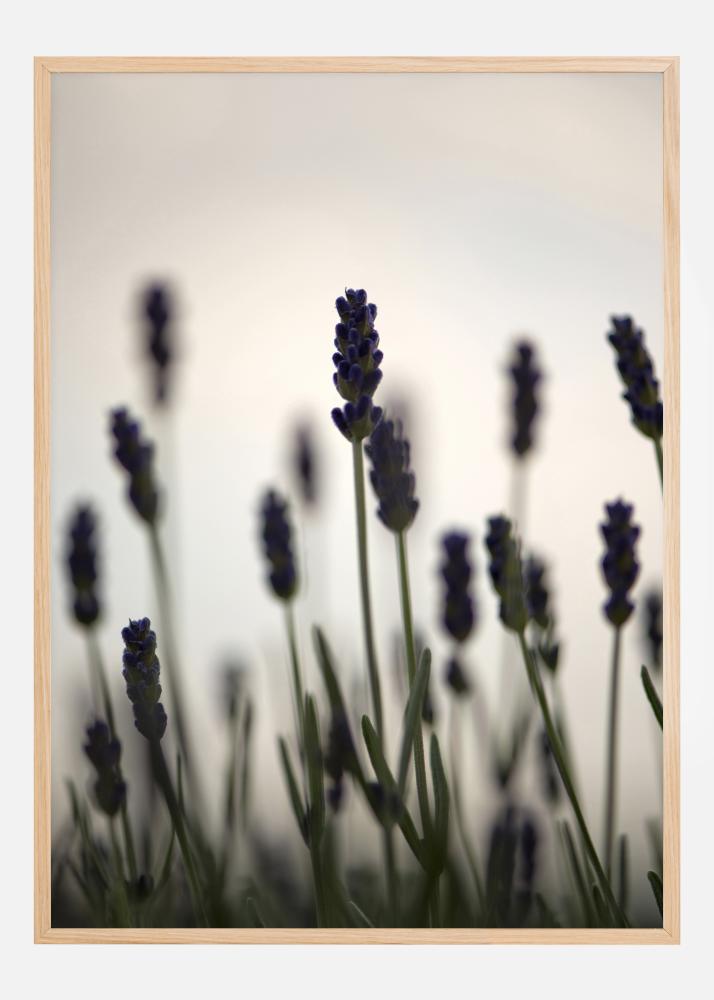 Ein florales Poster mit einer Nahaufnahme von Lavendelblüten auf einem Feld. Wenn man genau hinsieht, kann man die violetten Knospen erkennen, die sich an der Spitze der grünen Stängel wiegen. Sie heben sich von einem einfachen weißen Hintergrund ab und sind die perfekte Ergänzung für einen farbenfrohen Raum.