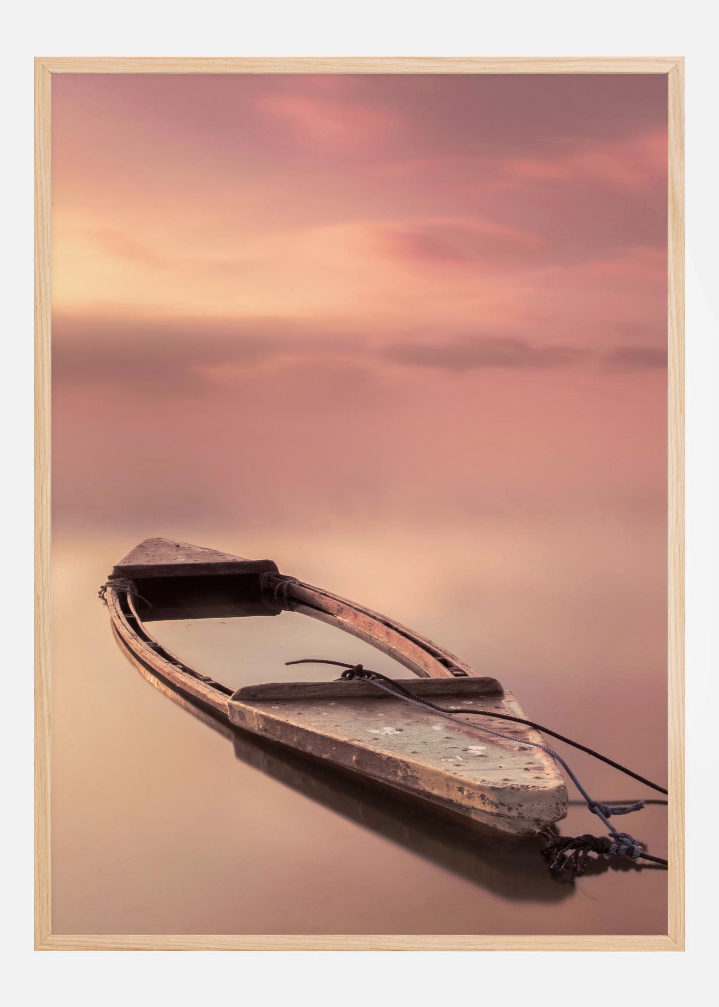 Ein ruhiges Poster eines Holzbootes, das auf einem stillen Gewässer sitzt. Das Wasser und der Himmel sind in sanften rosa und violetten Pastellfarben gehalten. Sie gehen ineinander über, so dass das Wasser und der Himmel für immer ineinander übergehen. Das Boot ist der einzige feste Gegenstand, der in diesem sanften, beruhigenden Bild im Mittelpunkt steht.