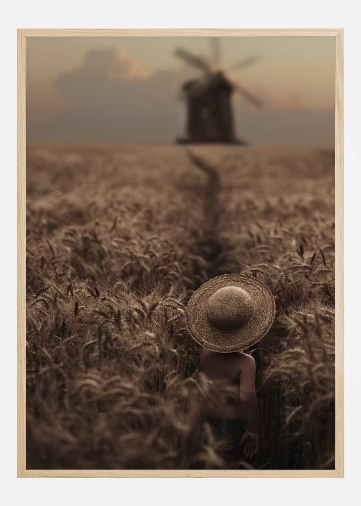 Ein Portraitposter eines Jungen in einem Weizenfeld mit einer Windmühle in der Ferne. Die sanften Gelb- und Rosatöne schaffen eine wahrhaft ruhige Stimmung. Wagen Sie sich mit dem Jungen auf diesem Bild an die Windmühle heran.