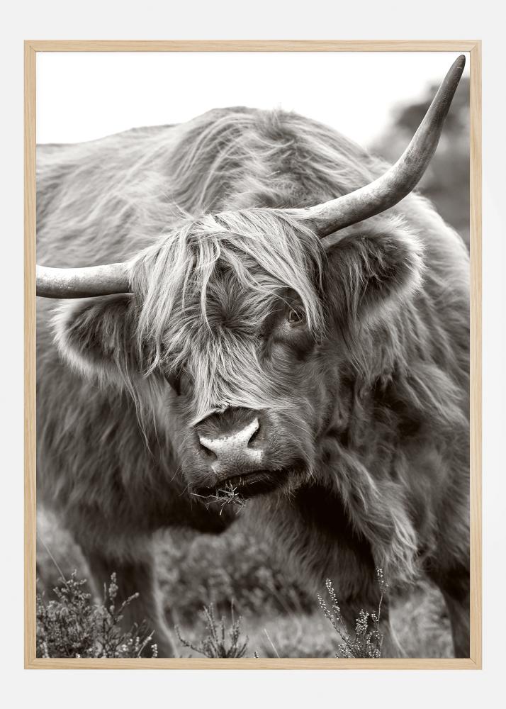 Ein Wildtierposter eines Hochlandrinderbullen. Der Stier lehnt sich in den Rahmen, sein Fell hängt über seine Augen. Ein Auge starrt in die Kamera, sein weiches, flauschiges Fell fängt das Licht ein, während er sich bewegt. Trotz der Hörner ist das Gesicht der Kuh weich und liebenswert, man kann fast die feuchte Nase spüren.