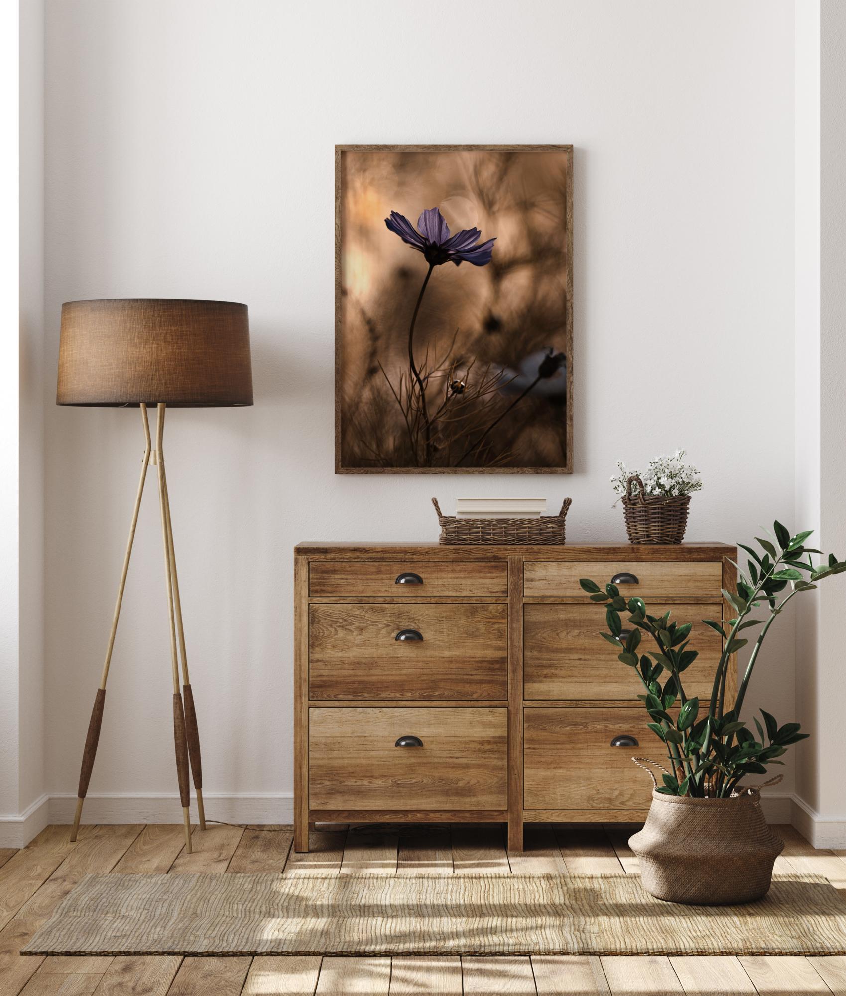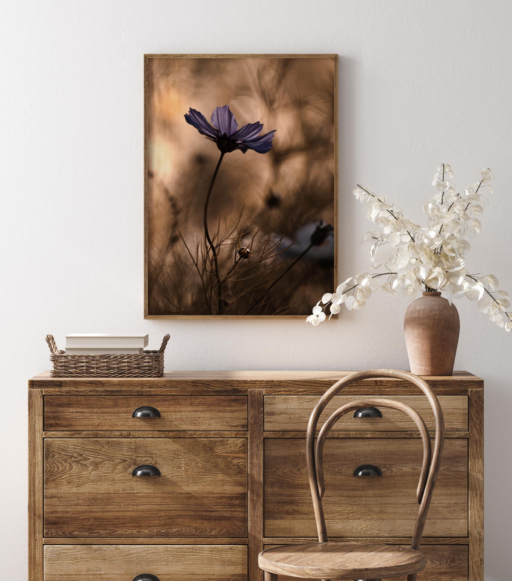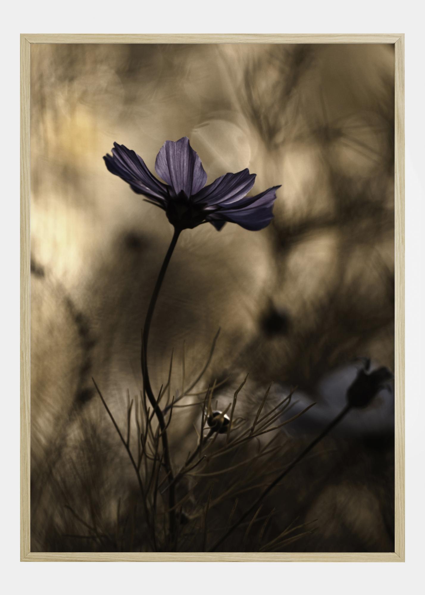 Ein Blumenposter mit einer leuchtend violetten Blume, die sich vor einem weichen braunen Hintergrund wiegt. Die violetten Blütenblätter heben sich effektvoll von den unscharfen Pflanzen im Hintergrund ab. Andere Formen sind zu erkennen, wenn das Auge entlang der geschwungenen Stängel wandert, um das gesamte Bild wahrzunehmen.