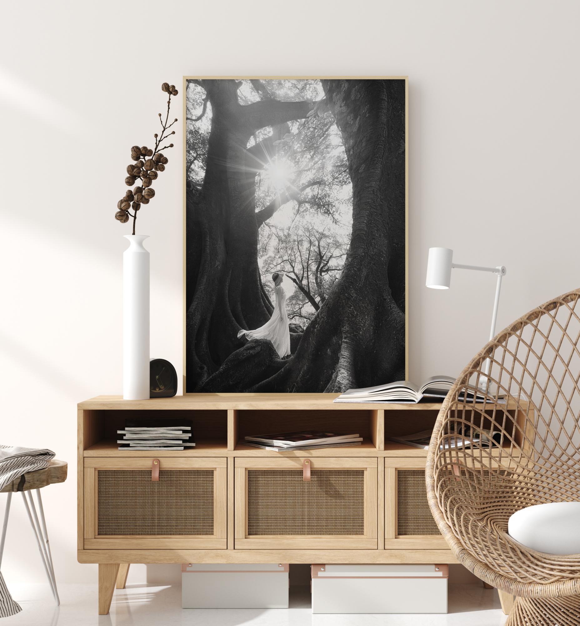 Ein atemberaubendes Naturposter mit riesengroßen Bäumen, einem Sonnenstrahl und einer dazwischen stehenden Frau. Der Lichtstrahl zieht den Betrachter in diese mystische Aufnahme hinein. Bringen Sie einen Hauch von Frieden und Ruhe in Ihr Zuhause.