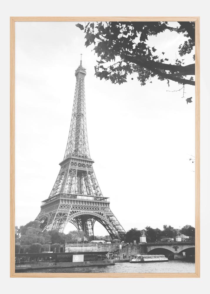 Ein Wahrzeichen-Poster des Eiffelturms in Paris. Der graue Turm hebt sich deutlich von einem weißen Himmel ab. Darunter ist das Treiben auf dem Fluss mit einem Boot und einer Brücke zu sehen. Ein Baumzweig verdeckt fast die Spitze des Turms in dieser einfachen, natürlichen Aufnahme dieses ikonischen Monuments.