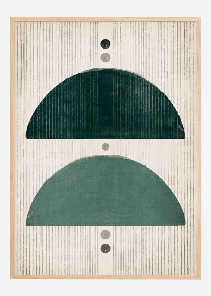 Dieses Poster ist mehr als nur ein dekoratives Bild; es ist eine zeitgenössische künstlerische Interpretation, die das Natürliche mit dem Stilisierten vereint. Die drei kreisförmigen Formen, zentriert zwischen den halbkreisförmigen Blöcken, dienen als Fokus, der die gesamte Komposition zusammenführt. Dieser Druck könnte als elegante Wandfunktion in einem minimalistischen Zuhause oder Büro dienen, und die beruhigenden Grüntöne würden jedem Umfeld ein Gefühl von Natur und Ruhe verleihen.