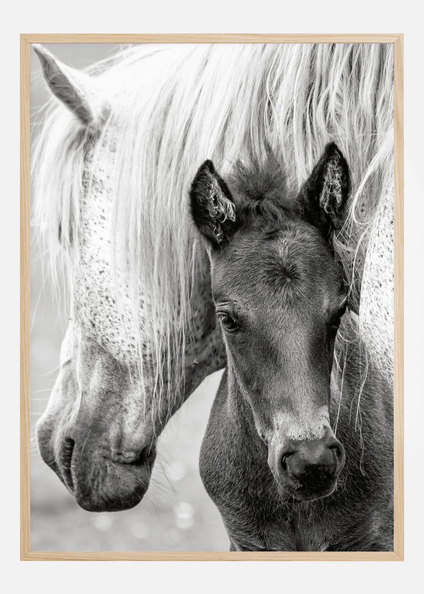 Ein Wildtierposter mit einer Stute und ihrem Fohlen. Die Stute beschützt ihr Baby, indem sie ihren weißen Kopf über seinen Rücken lehnt. Das dunkel gefärbte Fohlen starrt aus diesem Schutz heraus mit neugierig gespitzten Ohren in die Kamera. Genießen Sie dieses niedliche Babybild.