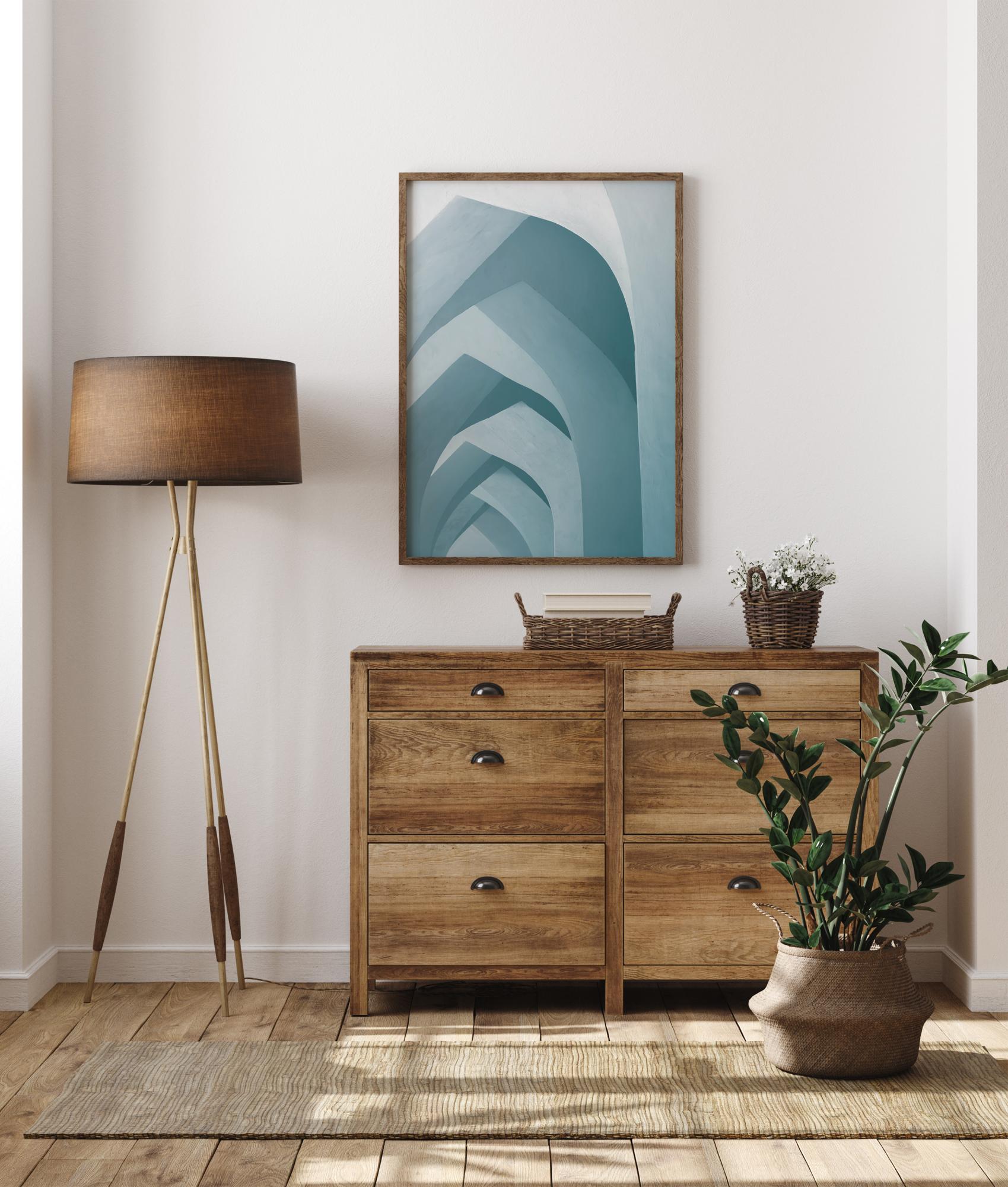 Ein grafisches Poster mit verschiedenen Formen, die Bögen bilden. Jede Bogenform wird durch die Verwendung von Blockfarben in verschiedenen Blautönen erzeugt. Dunkle und helle Farben stehen einander gegenüber, um die Illusion von Tiefe und das Gefühl eines langen Flurs zu erzeugen. Wenn Sie dies mit einer weißen Wand kombinieren, werden die Farben noch stärker kontrastiert.