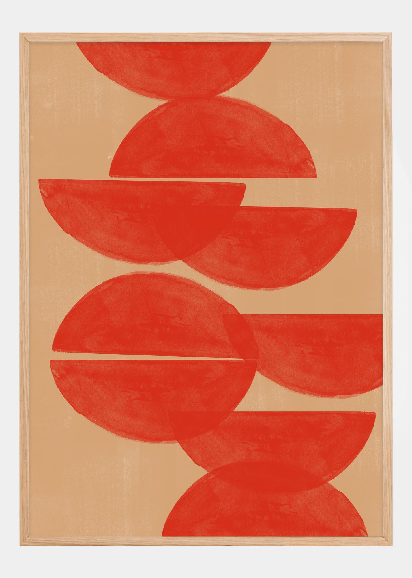 Dieses lebendige und fesselnde Poster stellt mit seinen überlappenden Halbkreisen in einer tiefen, rot-orangefarbenen Palette einen kühnen Ausdruck dar. Das Motiv, das von Natur aus geometrisch ist, wiederholt Halbkreise in einer fast rhythmischen Ordnung und schafft ein Gefühl von Bewegung und Dynamik auf dem beruhigenden beigen Hintergrund. Es ist ein Druck, der jedem Raum, in dem er sich befindet, einen zeitgenössischen Touch und einen energischen Fokus bietet.