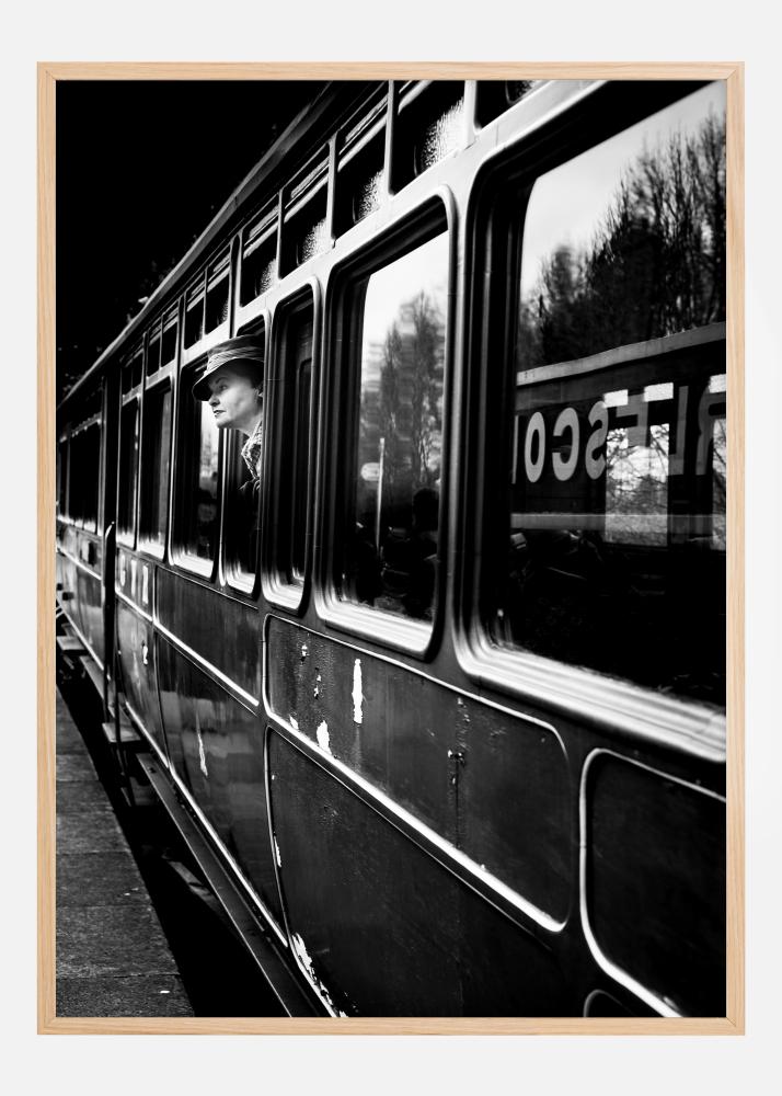 Dieses ansprechende Schwarzweiß-Poster fängt einen nostalgischen Moment einer Person ein, die aus einem Zugfenster schaut. Die Person, gekleidet in einem klassischen Hut, verleiht dem Bild ein zeitloses Gefühl, während die Reflexionen und Kontraste eine dramatische und emotionale Atmosphäre schaffen. Die spiegelglatte Oberfläche des Zuges und die dunklen Konturen tragen zu einem Gefühl von Bewegung und Veränderung bei.