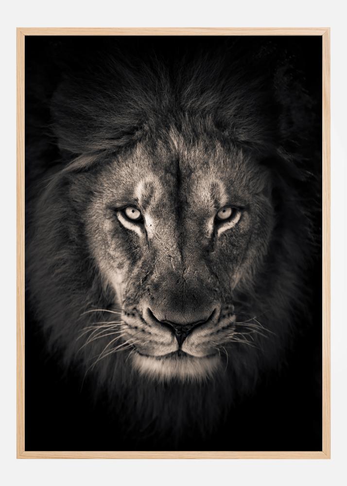 Dieses kraftvolle und packende Poster fängt den tiefen Blick eines Löwen ein, was ein Gefühl seiner Stärke und Präsenz vermittelt. Die schwarzweiße Tönung verleiht dem Bild eine zeitlose Qualität und betont die majestätischen Züge des Löwen und die Intensität, die in seinen Augen liegt. Es ist ein Druck, der Autorität und Wildheit ausstrahlt, eine ideale Darstellung des 'Königs des Dschungels'.