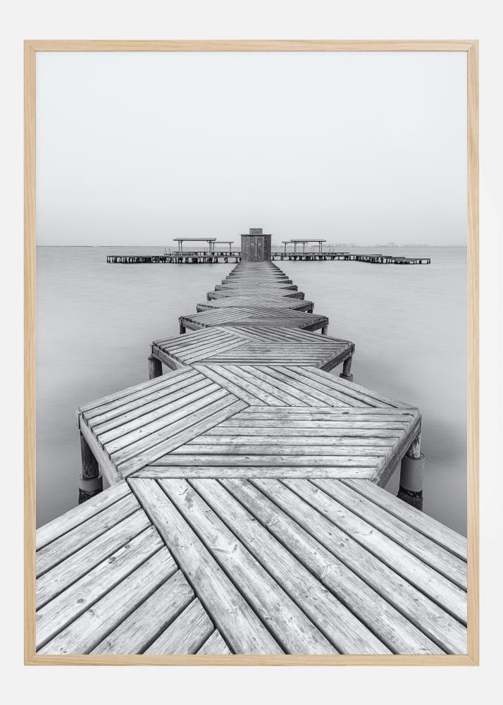 Ein witziges Poster eines sechseckigen Stegs, der sich über einen stillen See in die Ferne schiebt. Das Bild ist in gedämpften Grautönen gehalten, die es eher kühl als warm wirken lassen. Der hölzerne Steg führt Sie in die Ferne, wo das Anlegen auf Sie wartet. Kombinieren Sie es mit einer hellen Farbe, um Wärme zu erzeugen.