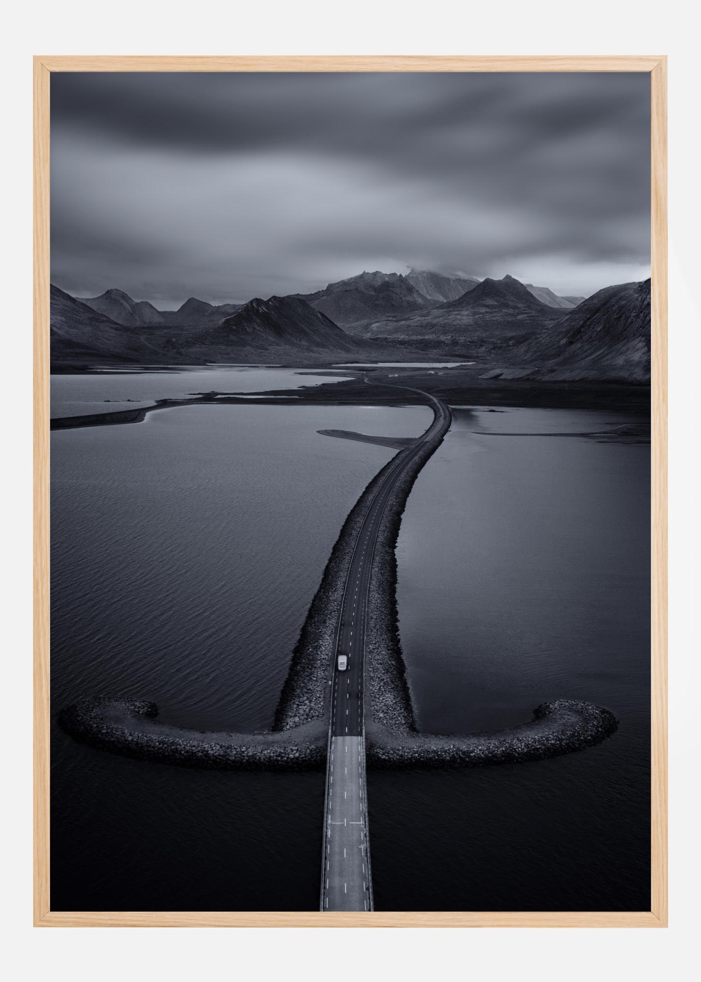 Ein graues Poster einer breiten Straße, die sich durch Seen und in die dahinter liegenden Berge bewegt. Ein grauer, wolkenverhangener Himmel hängt über dem Bild. Ein einzelnes weißes Auto fährt auf der Straße in die Ferne. Kombinieren Sie es mit einer hellen Wand, um etwas Farbe in dieses strenge Bild zu bringen.