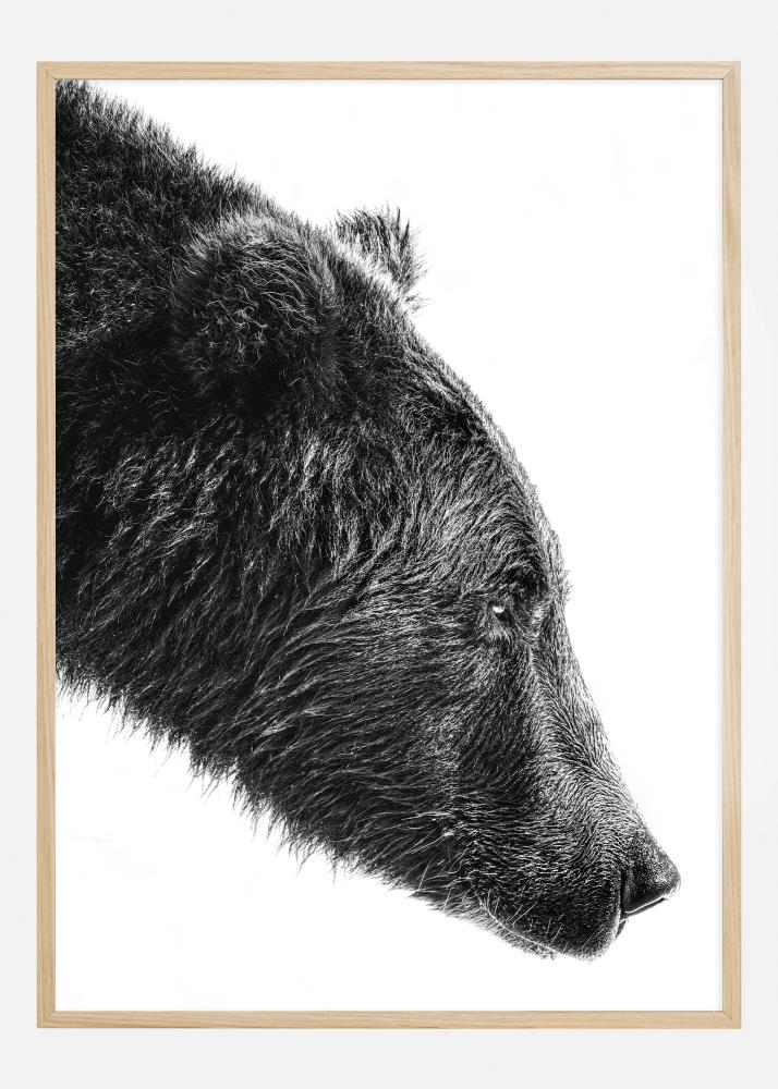 Dieses stilvolle und kraftvolle Print zeigt eine Nahaufnahme eines Bären in Schwarzweiß, ein Motiv, das ein rohes und ehrliches Gefühl des unbezwingbaren Geistes der Natur vermittelt. Das Bild konzentriert sich auf das Profil des Bären, wobei jedes Detail im Fell und die ruhigen Augen dank des Kontrasts zwischen den dunklen und hellen Tönen hervorgehoben werden.